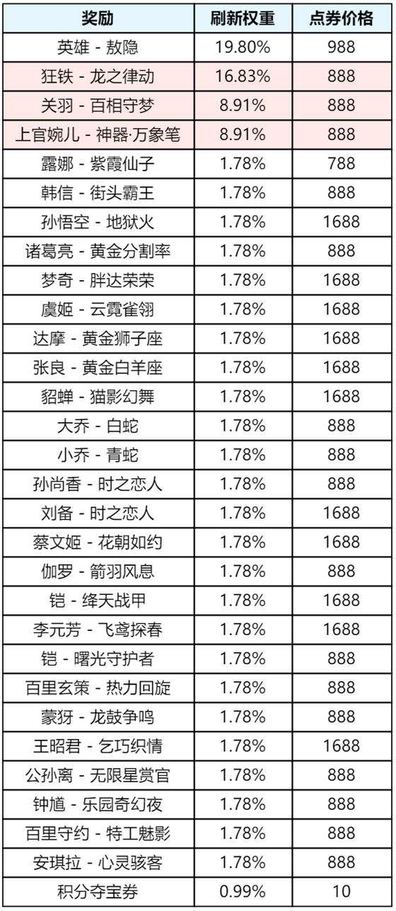 本次更新了2款限定返场皮肤,其余刷新概率、折扣概率均不变,奖励列表详见下方:![]()