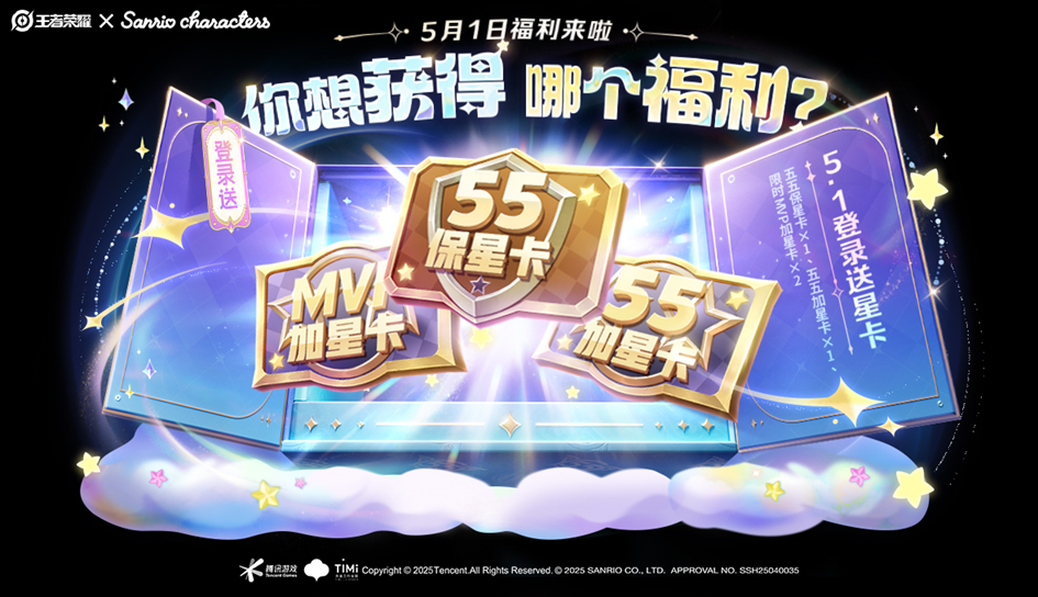 活动奖励:5月1日当天玩家可通过集合页“送加星卡&保星卡”入口领取五五保星卡x1、五五加星卡x1、五五限时MVP加星卡x2;5月1日-5月7日,玩家还可通过集合页右上角“星朋友领称号”入口完成五五回顾,符合条件的玩家可领取「五五星朋友」限定称号