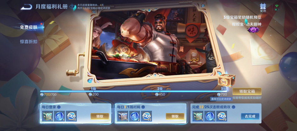 *上架后该皮肤仍可在月度福利礼册通过开启3级宝箱免费概率获取:通过完成“免费皮肤奖池”每日任务积攒宝箱进度值,升级宝箱至3级,开宝箱概率可得。