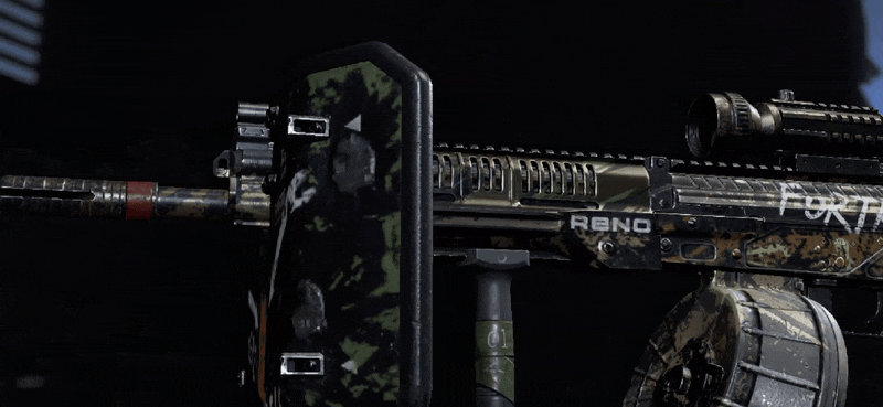 雷诺伊尔的代表性武器【壁垒·RPK16】以及【壁垒·AN94】。绿色、黑色与铁锈色的斑杂涂装,足以见得这是在战士手中多次经历实战的武器。