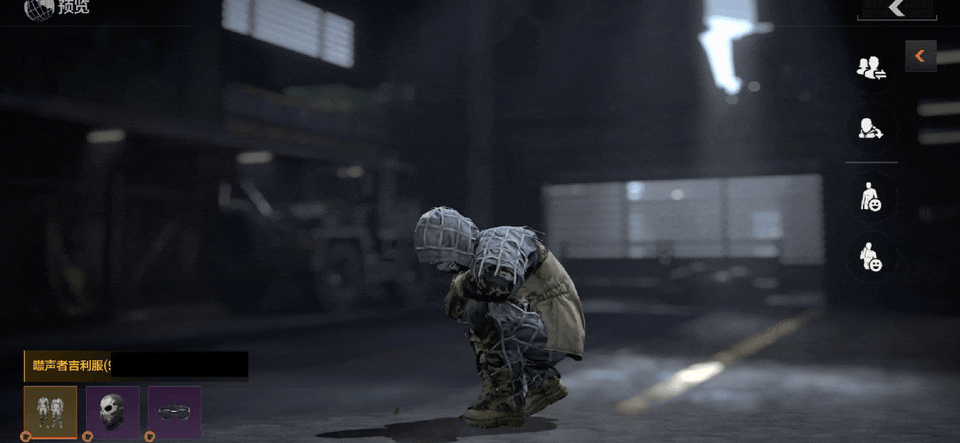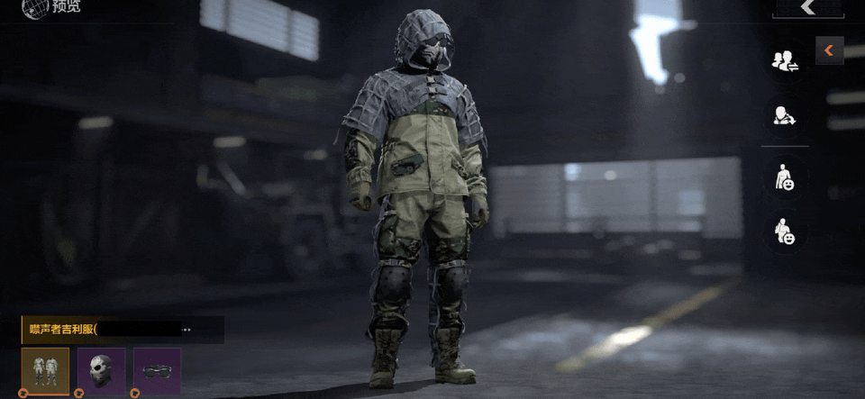 「噤声者吉利服」采用了军绿色为主色调,在肩部、腿部等区域装配了大面积的织带,用于将杂草、树叶等编织在上面,以模拟不同的作战环境,对自身进行伪装。