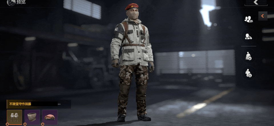阿贾克斯同款外观「不败坚守作战服」,由上身的灰白制服和下半身的褐色迷彩长裤组成,关节及易磨损部位以深色加厚面料点缀,外观干练简约,突出实用性。标志性的红色贝雷帽与面巾也作为部件被纳入整套外观之中。