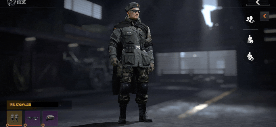 雷诺伊尔同款外观「钢铁壁垒作战服」,该套装由披风、贝雷帽与墨镜三个部件组成,黑与灰的肃穆配色勾勒出了一个饱经战火洗礼的战士形象。
