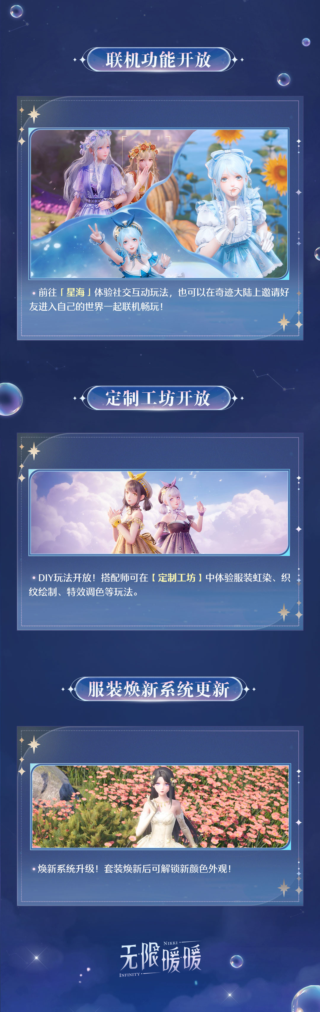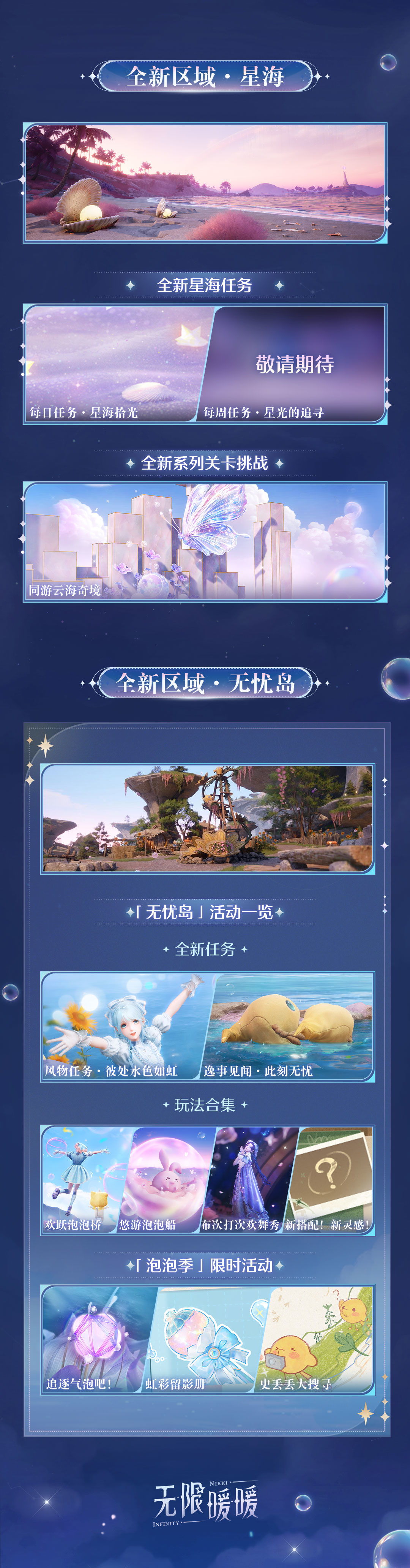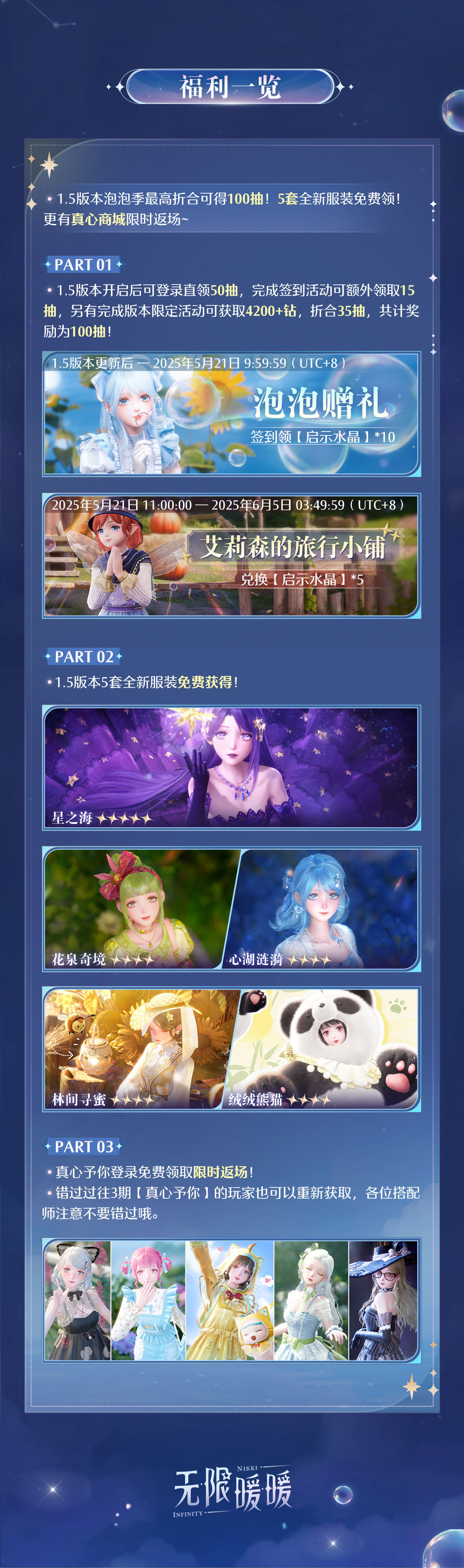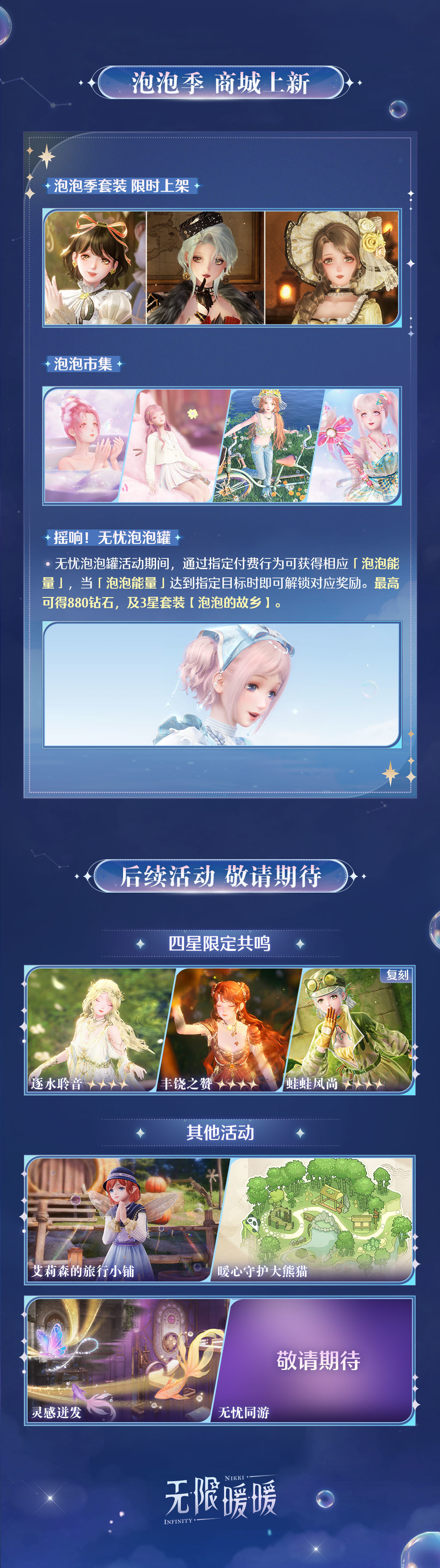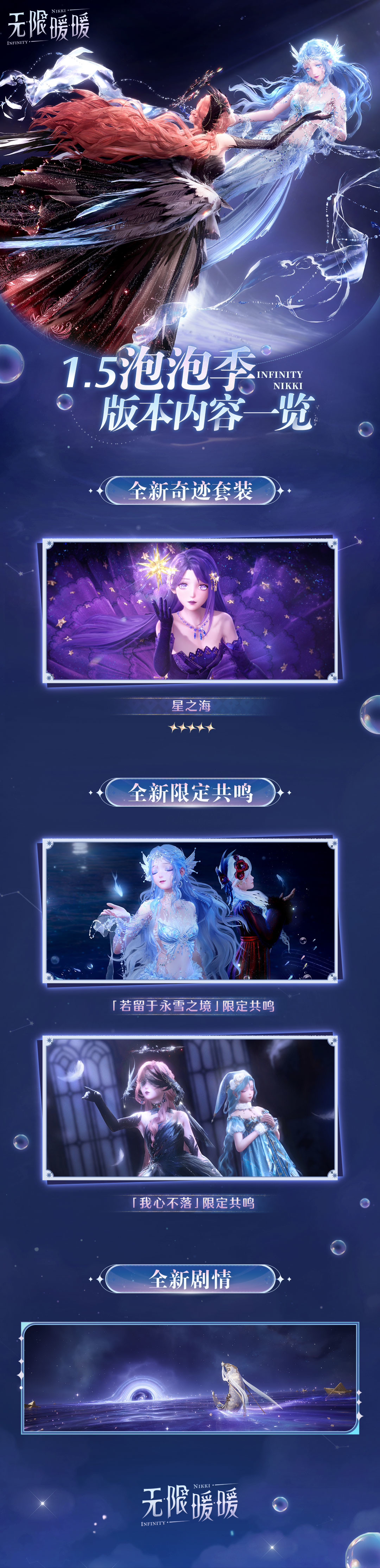 《无限暖暖》1.5版本泡泡季 | 版本内容一览光环小G发布于 04-29关注1.5版本「泡泡季」将于4月29日全球同步开启!这里给搭配师们整理汇总了目前1.5版本的全部爆料内容,带大家全面了解1.5版本的套装、共鸣、地图、玩法、活动、福利等超多情报!此外还有版本后续活动爆料哦(*´∀`)~♥