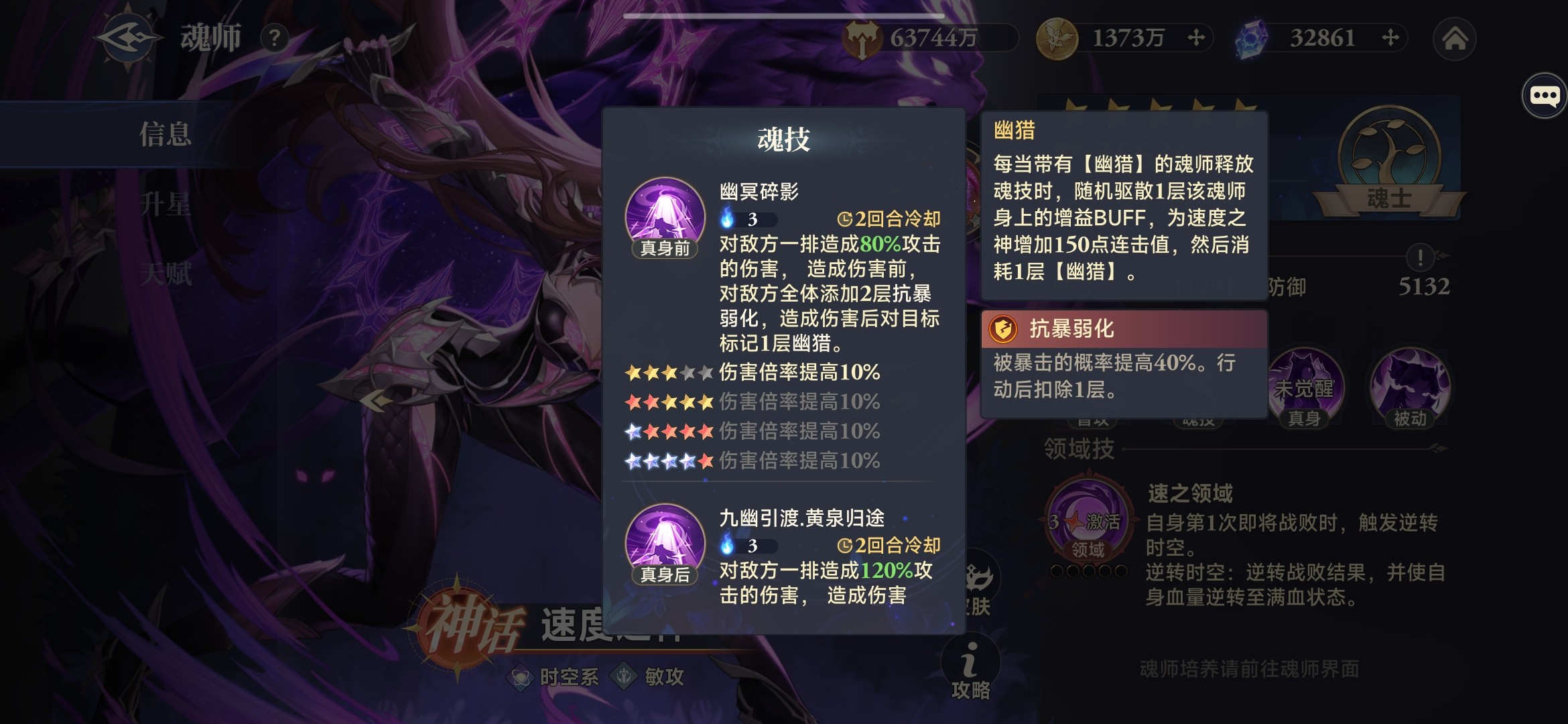 ②【暗狩】:速度之神每次普攻、魂技、连击、反击、协助攻击都获得1点【暗狩】,回合结束立即释放一次特殊魂技,对敌方全体造成100%攻击的伤害,每1点【暗狩】印记额外叠加30%伤害,最高不超过10层,回合结束清空。这一特殊标记赋予速度之神全体攻击能力,进一步丰富和提高了其输出能力。