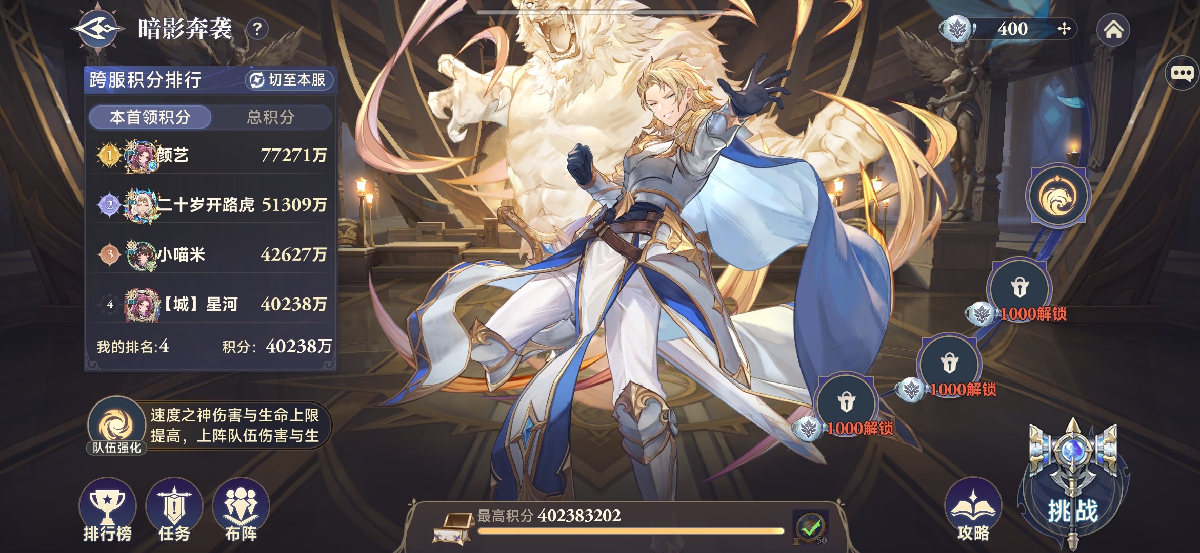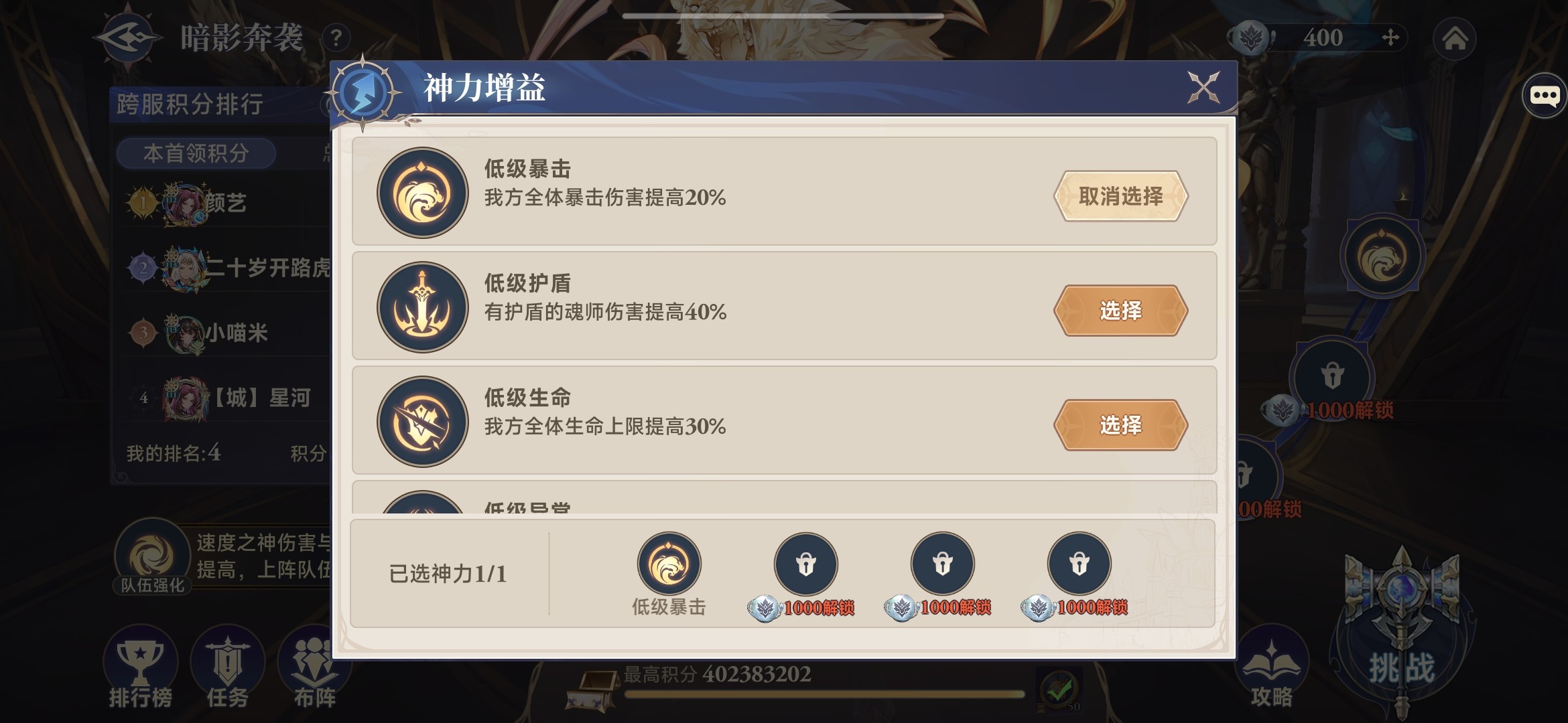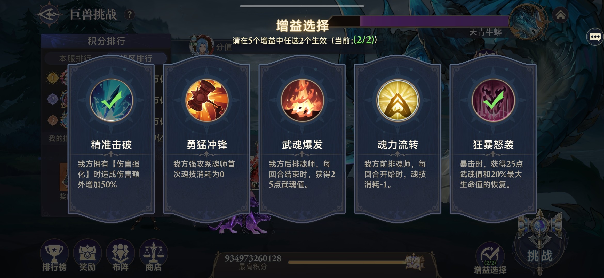 另外,巨兽挑战增益共34种,每期随机出现5种,从中选择2种。因此,在增益选择上,为了配合速度之神,优先选择【追加进攻】【精准打击】等增益效果。