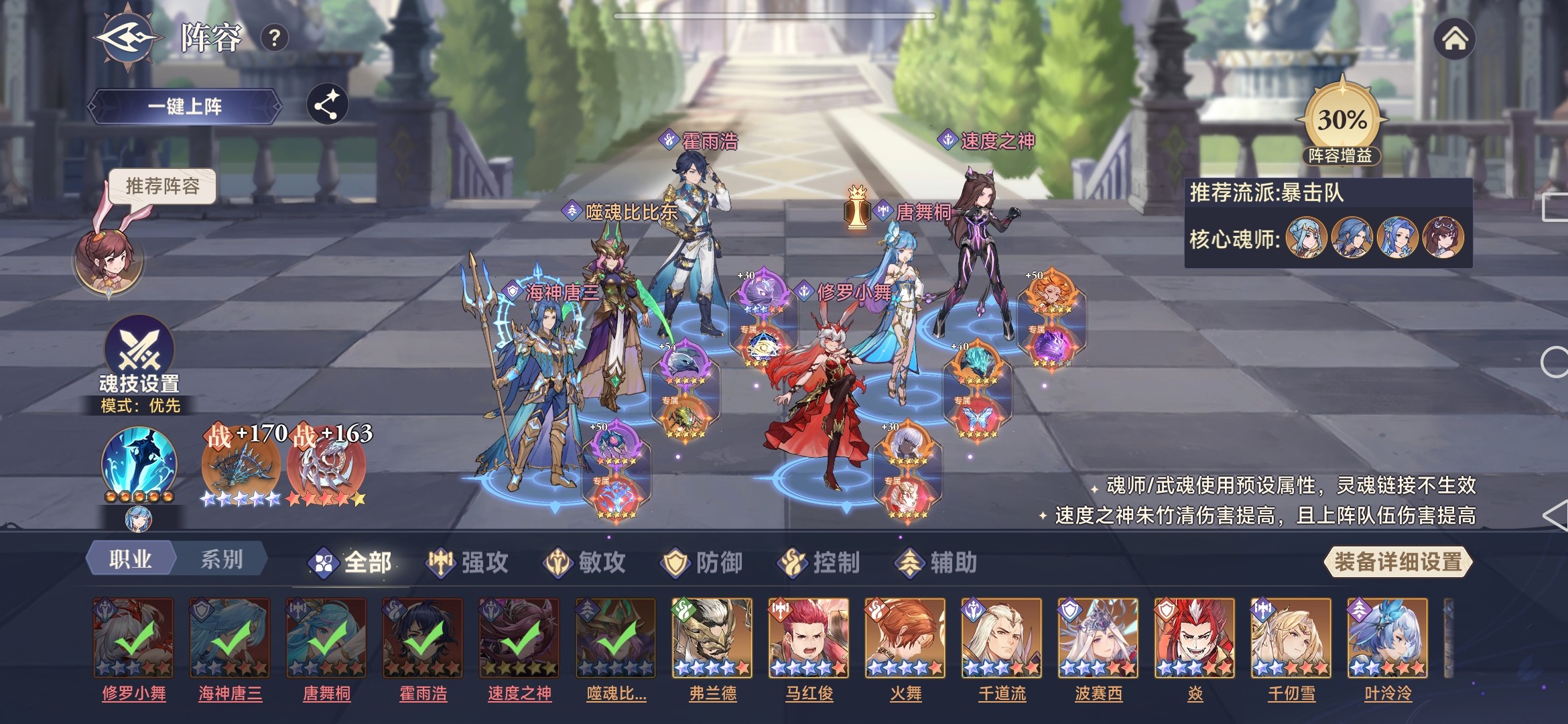 此时,速度之神基本功能都具备,拥有幽猎、冥猫、疾速猎杀、暗狩等效果。所以,采用三核队,速度之神、唐舞桐、修罗小舞作为核心输出,霍雨浩控制,噬魂比比东加时空魂力、海神唐三加护盾。