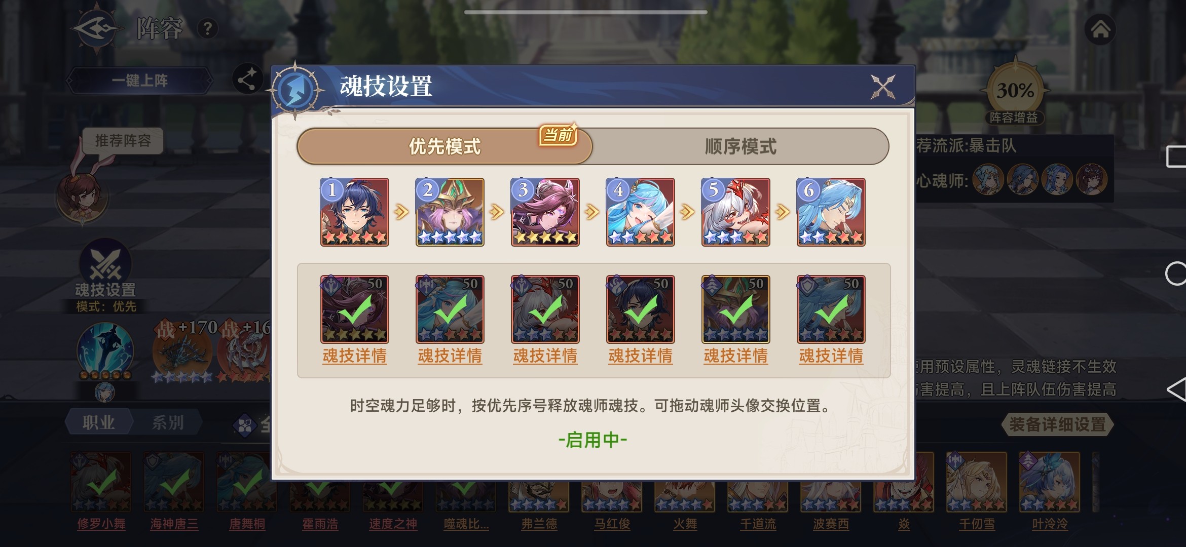 采用优先模式,霍雨浩、噬魂比比东首次释放魂技无消耗,魂技前置;速度之神、唐舞桐、修罗小舞依次释放魂技,积攒状态极限输出;海神唐三最后释放魂技,增加队伍坦度。