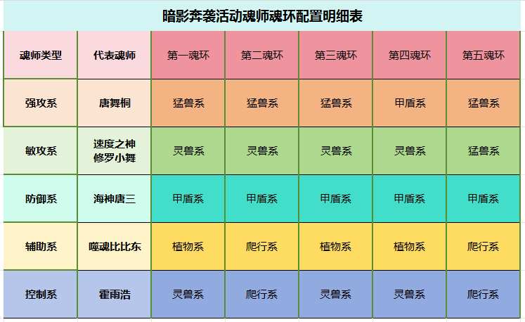 【暗影奔袭】属于长图挑战,所以魂环选择上侧重于长线输出,将强攻系第四魂环、敏攻系第五魂环的前三回合输出魂环替换掉。辅助系、控制系佩戴爬行系魂环能增加对位和灼烧伤害。
