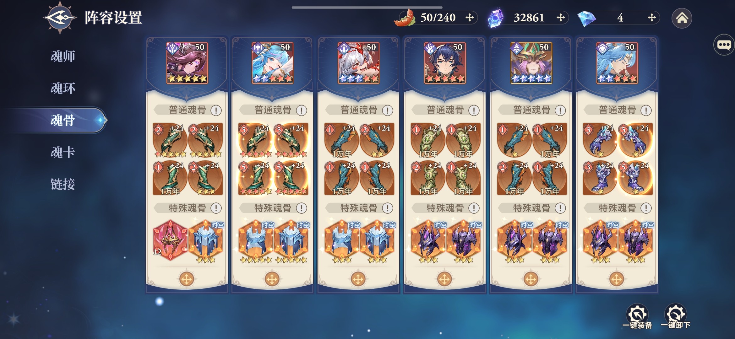 其他魂师的魂骨由系统推荐确定,外附魂骨都选择烈火杏娇疏,而时空魂师搭配时空外附魂骨—八角玄冰草、暗魔邪神虎,能够最大限度的为全体提供增伤和减伤。