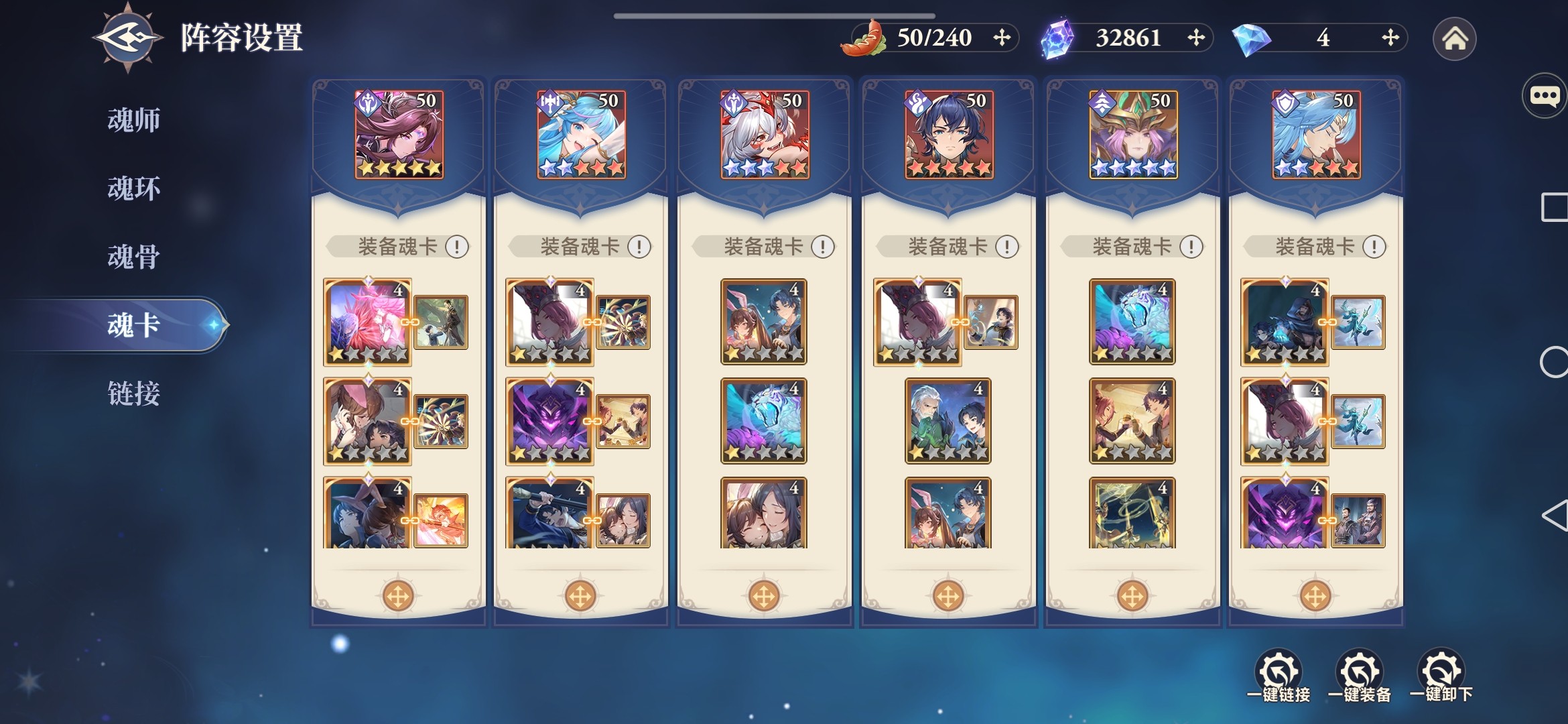 按照魂师特点,合理装配时空魂卡和普通魂卡。比如,速度之神(昊天初显、教皇冕下等)、唐舞桐和修罗小舞(小舞的叹惋等)、海神唐三、霍雨浩和噬魂比比东(父子的羁绊、第一魂环等)。如果没有时空魂卡,则搭配传说、史诗魂卡(黄金铁三角、幽冥白虎)。