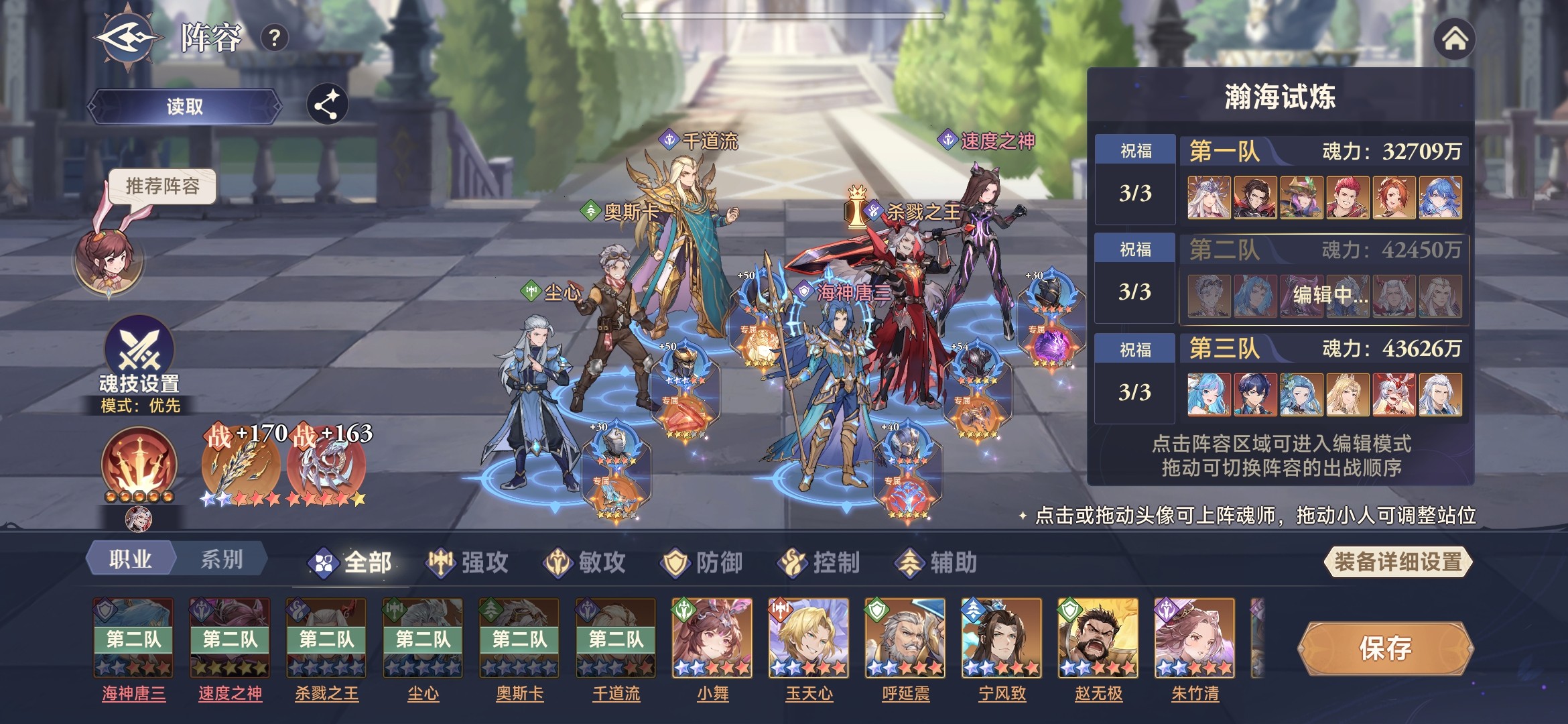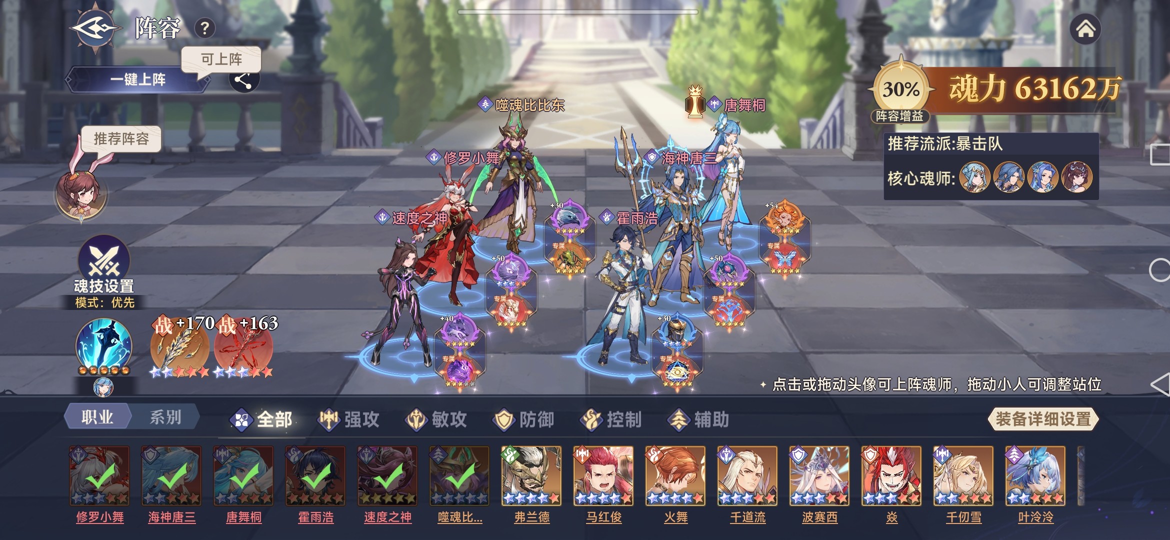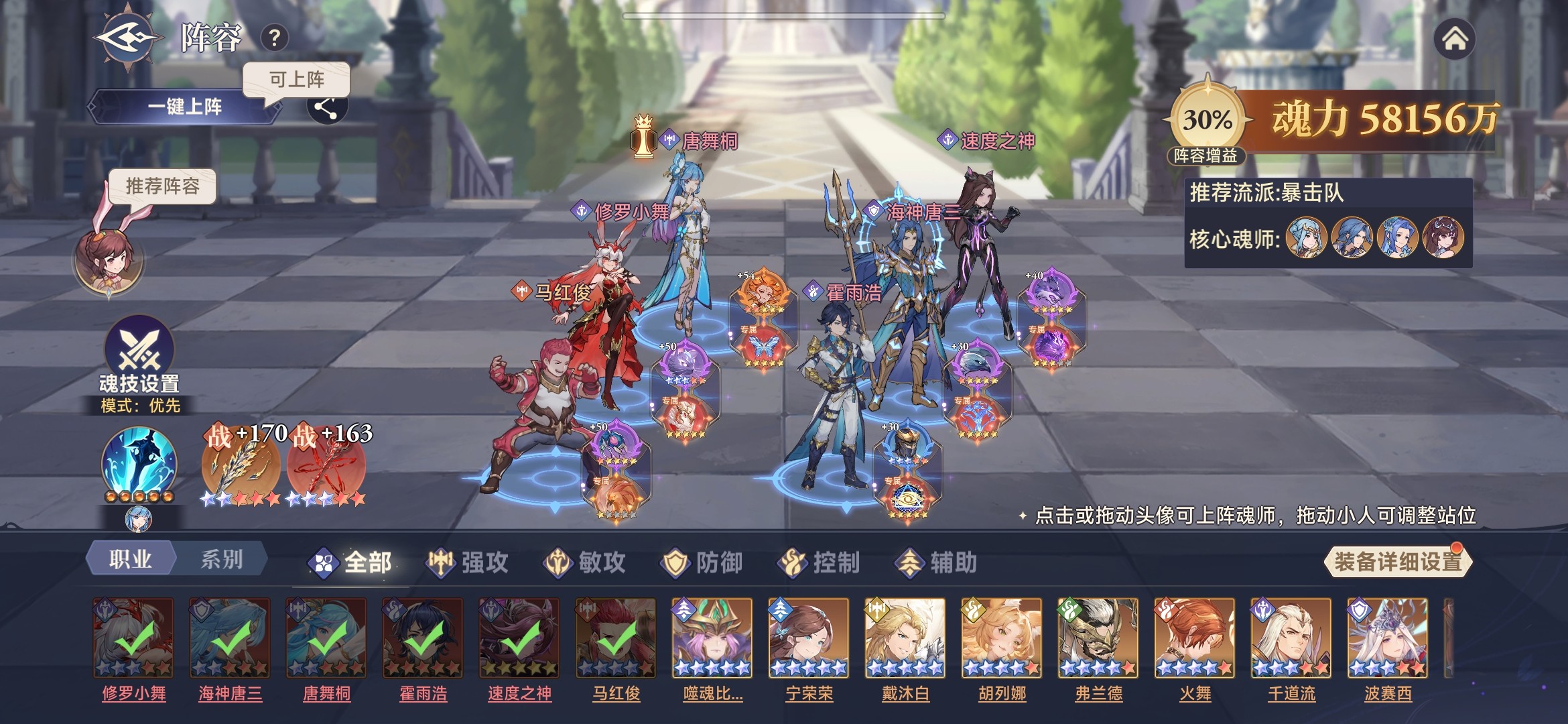 速度之神作为主C,站1号位,率先出手,噬魂比比东作为辅助魂师,对位敌方首领怪,唐舞桐、修罗小舞在前排,补充伤害。海神唐三在后排抗伤、持续加盾。