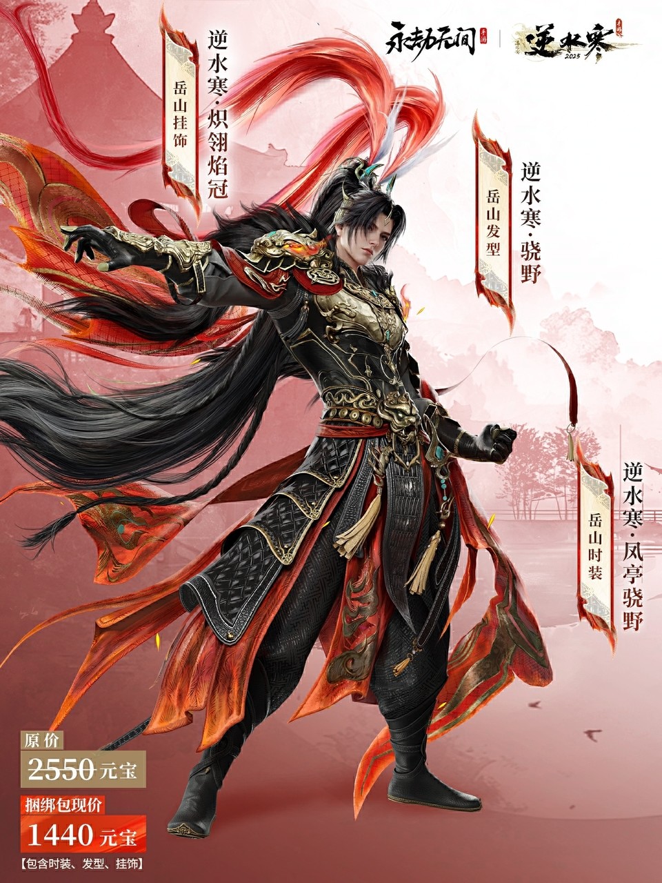 2、新增岳山捆绑包【吕布捆绑包】。捆绑包内含岳山极品时装【逆水寒·凤亭骁野】、岳山极品发型【逆水寒·骁野】、岳山极品挂饰【逆水寒·炽翎焰冠】。捆绑包原价2550元宝,折扣价1440元宝。单独购买对应单品即可享受折扣,购买捆绑包将享受更多折扣。