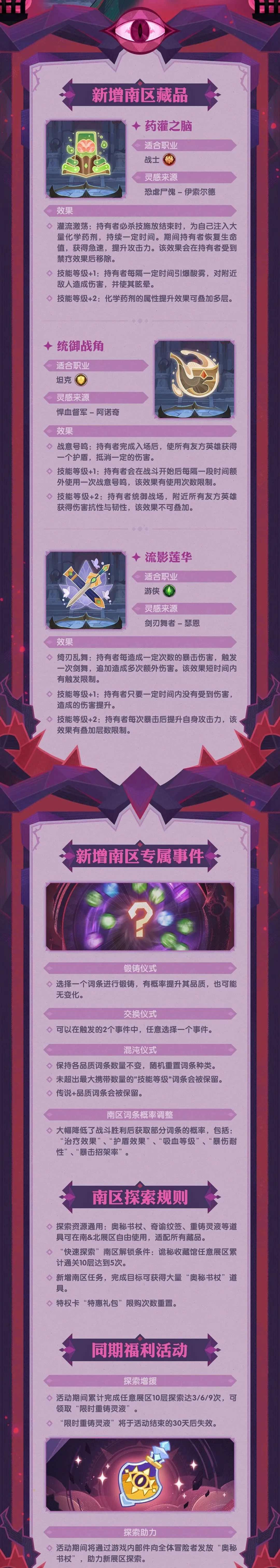 -新增藏品“药灌之脑”、“统御战角”、“流影莲华”,通关5-40的冒险者可以前往诡秘收藏馆南区探索获取。