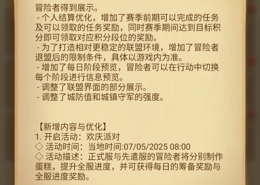 ◇活动描述:正式服与先遣服的冒险者将分别制作蛋糕,提升全服进度,并可获得每日的筹备奖励与全服进度奖励。