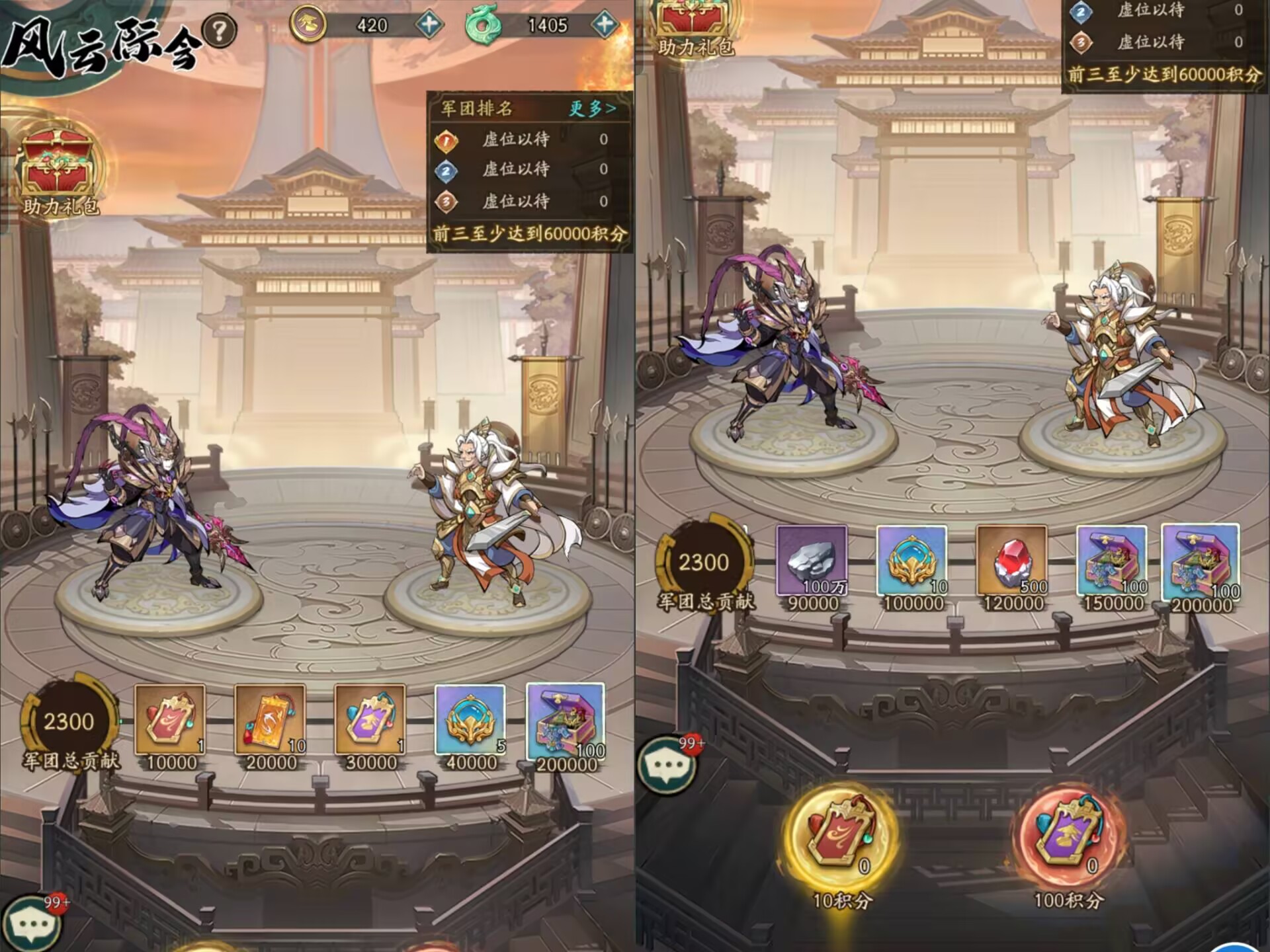 ①【风云际会】玩法解析。需要通过军团的成员们捐献:【风云令】和【豪侠令】获得积分贡献,从而获得本次合服的丰厚奖励。