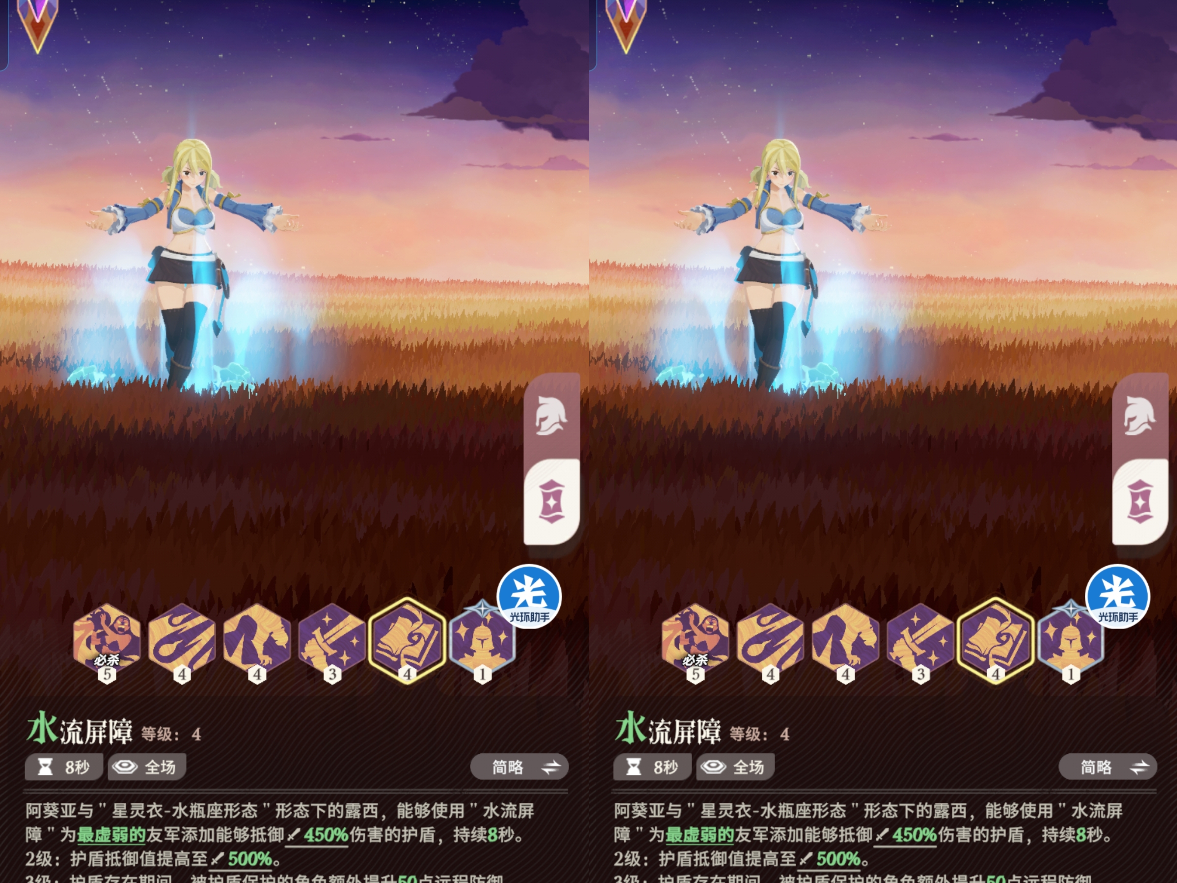 ①进入星灵衣的露西,能够释放水流屏障制造一个抵御550%伤害的护盾,保护最虚弱的队友,持续8秒。