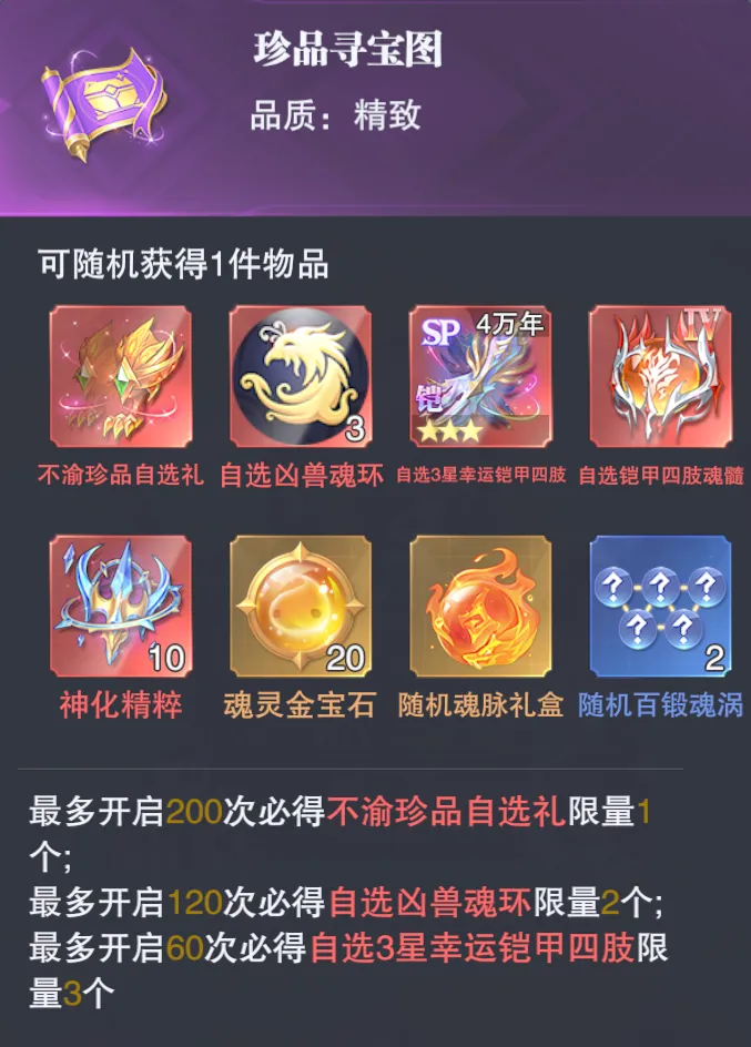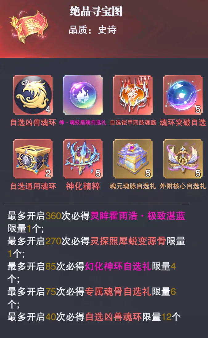 首先我们来说魂兽巡猎这个活动,此活动倒是有些类似于特定期间官方会上的那个交换卡片活动与过去猎魂小队活动的结合,因为我们真正上手也不会特别陌生。这里我们需要使用引兽草来勾引不同的魂兽,而且其引兽的地点还会关联大陆游历活动中所达到的里程,历程越高则我们可以进入的猎魂地点就越深入,相对能获得稀有魂兽的可能性也会提升。 而我们在引兽的过程中还得玩一个小游戏......记得当游标移动到最中央的红色框框内按下捕捉按钮即可,然后我们就能看到下图中的这个引兽成功的画面,即收集到了不同类型的魂兽。最后在这个活动中,我们可以通过收集到的不同魂兽来激活图鉴,激活到一定数量后即可获得奖励,另外这个活动一共有四页,所以和过去上线过的卡片交换活动真实如出一辙,后续几天又会生出不少的卡片商人了......此外这个引兽草的数量嘛,每日完成大陆游历中的任务可以基础拿到12个,其余的则需要听过购买礼包来获取。接着我们回到大陆游历这个更加关键的活动部分,这个活动说白了就是需要我们通过使用“珍品寻宝图”和“绝品寻宝图”来提升我们行驶的里程,这个里程大家理解成常规活动中的积分即可,反正里程越高可以解锁的东西越多,而且排名也会更靠前,那么在使用两个不同类型的寻宝图后不仅可以提升我们的里程,还能开出一些资源,而这两个寻宝图就相当于是常规活动中的两个不同级别的秘藏,大家如此来理解即可。此外通过完成任务,或者商城购买等途径我们还能给马车进行升级,升级后的马车可以提升行驶里程的倍率和其他属性。接着关键点来了,首先开启这个珍品寻宝图我们能获得的关键奖励有200抽保底的SP宁荣荣左腿专属魂骨自选,还有每120抽可以获得的3个凶兽魂环自选,其中可以选到九眼玉蟾或者是阴阳鸟,其余则是一些常规类资源了。那么针对珍品寻宝图,每日任务可最多拿到24个,5天活动就是120个,然后活动限时任务最多可拿到100个,这里加起来就是220个了,最后商城每日送5个,5天活动就是25个,最多加起来相当于能拿到245个珍品寻宝图,其中所有的奖励都可保底获取,当然就是完成任务方面需要消耗一些体力和钻石,大家还需注意。接下来则是更为关键的绝品寻宝图,这个图......里边包含的高阶奖励分别有360抽保底的SP霍雨浩皮肤,此皮肤应该算是死灵法系列的皮肤吧,维一个人觉得质量还行。接着是270抽保底的SP霍雨浩左腿进化魂骨,此魂骨最主要的功能还是长图增伤,但这个理论增伤值并不好算,后续我们再做实测。然后还有85抽保底1次的神环自选,这里可选的是SP霍雨浩的神环,75抽保底的SP霍雨浩左腿专属魂骨,最后还有40抽保底的4个凶兽魂环自选,可选到的凶兽魂环依然是九眼玉蟾或阴阳鸟。- 每日128钻石/抽,每日限购15个,相当于每日最多消耗1920钻石获取15抽,5天活动就是消耗9600钻石获取75抽