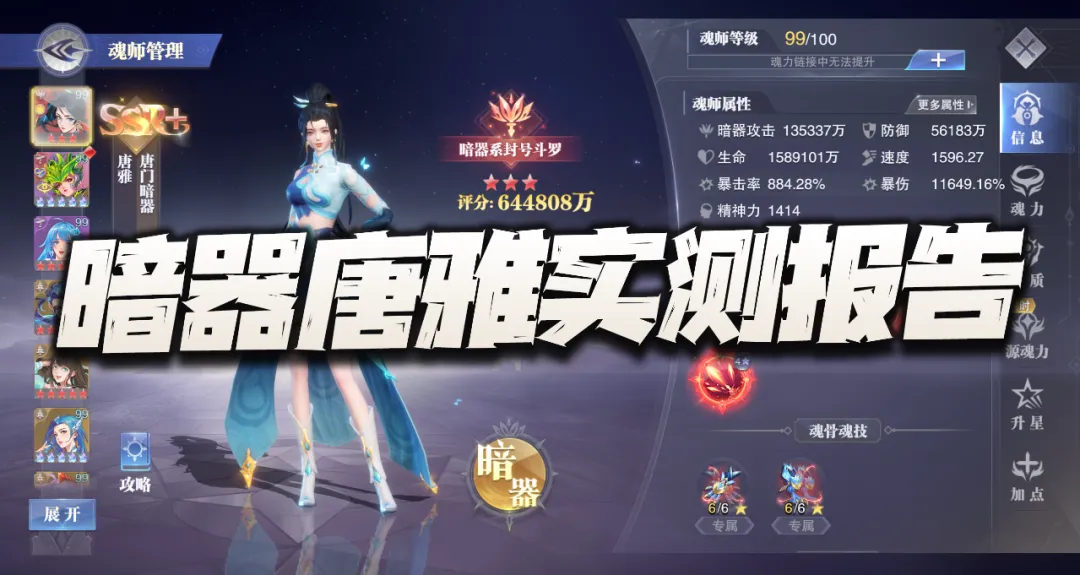 而即使是把SP千道流给换成徐三石,其伤害也和暗器唐雅的阵容会有约10多万倍的差距,所以仅仅红色3星的暗器唐雅便能有如此威能?这个真心有点吓人了,其实测试做到这维一就已经在想了,既然暗器唐雅都给做成这样了,那何必还要搞成一个暗器魂师呢,你直接给个SP品阶常规魂师不就好了,当然而由于暗器唐雅可以链接任意一个支柱,所以她作为SSR+品阶魂师还没有无法开启9环的困扰,速度等属性方面也是能够跟得上开启9环后的队伍进度的,因此大家之前能想到暗器唐雅居然是来替代SP千道流和徐三石的么.....诶,有意思了,大家还请量力而行吧。