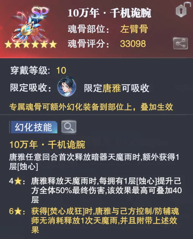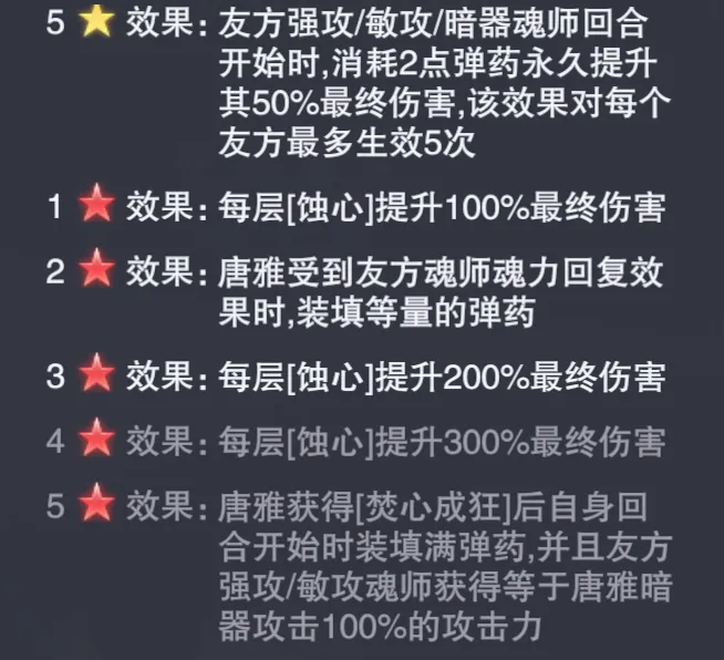 暗器唐雅的自带技能可以提升其生命,这也是作为生命位增伤魂师必备的效果,接着其中又包含了“蚀心”的增伤效果,最高每层可以增伤300%的最终伤害,20层后唐雅可以获得“焚心成狂”效果,进一步提升相关的输出和增伤能力。