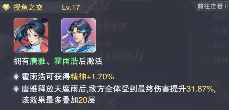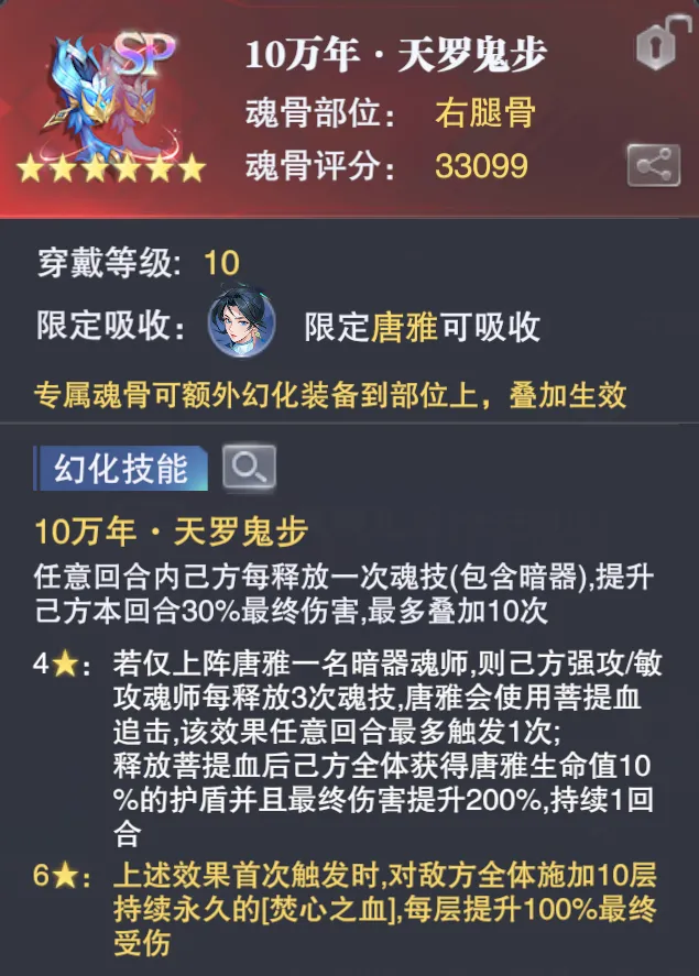 而更为关键的则是右腿骨,其可以提升单回合内的伤害,又能够给予唐雅在使用菩提血后一个给友方全体的护盾能力,有了这个能力后暗器唐雅才可以在长图生命位上吃到鱼......所以长图想玩唐雅这块骨头几乎就是必拿的,最后黄色6星还能给对方全体施加1000%最终伤害的提升效果,可谓是恐怖如斯......