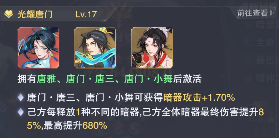 PS:由于现阶段的暗器副本数量都非常少,所以普通玩家为了这么少的战斗场景区养暗器队无疑也是相当不划算的,所以官方也是考虑到了这个问题,这次才把暗器唐雅给做成了个以增伤为主的“生命”位暗器魂师......够奇葩吧,而且更奇葩的还在后边。