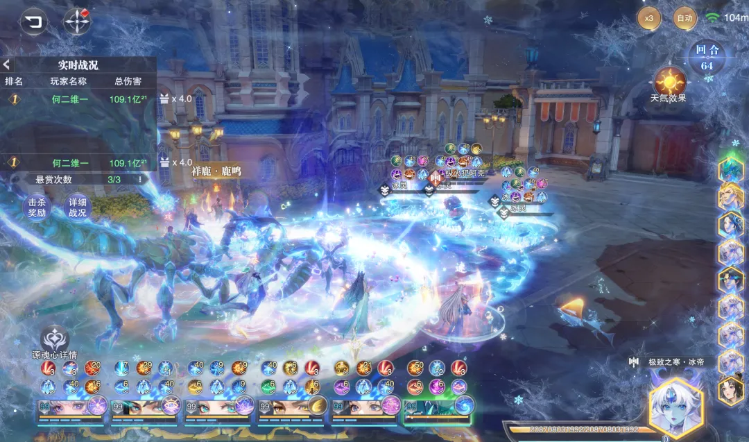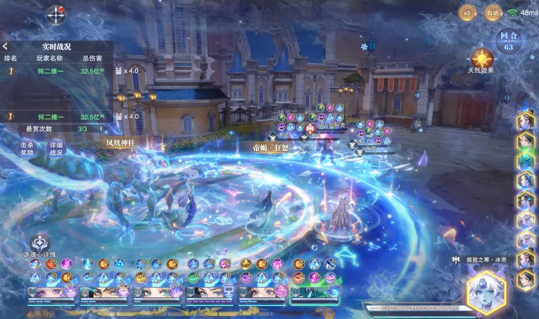 实测的战斗场景为世界悬赏的5桩敏攻系boss,我方主C用SP冰帝,阵容为标准的5条鱼+6神佑+7情绪阵容,其中因为测试号的SP宁荣荣源魂心是带在SP千道流身上的,所以在暗器唐雅代替SP千道流上阵后,此阵容就没有6神佑的效果了,这点大家还请先行注意。而作为对比,SP千道流几乎为满配,徐三石也几乎为满配,而唐雅则暂时为红色3星,源魂力升到6级。