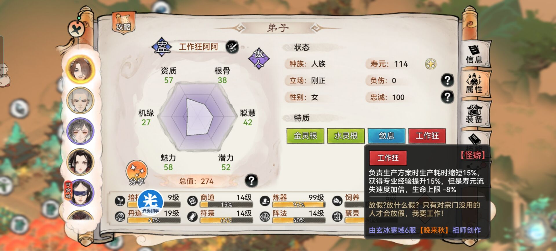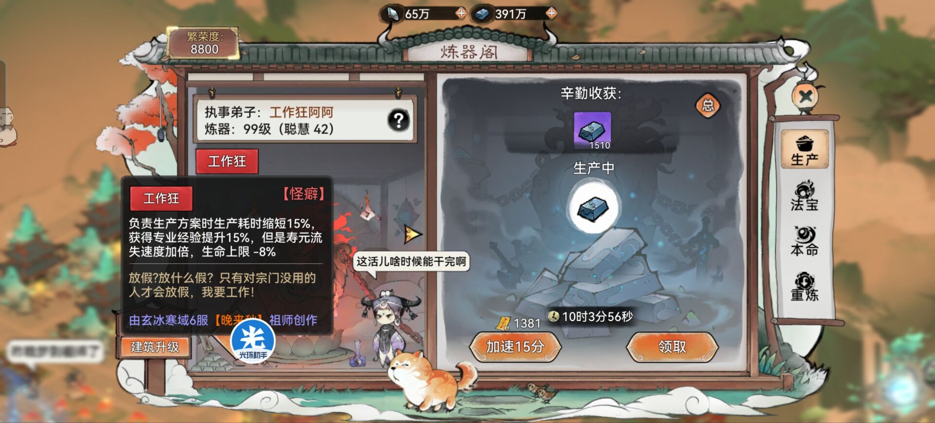 工作狂弟子:顾名思义就是带有【工作狂】怪癖的弟子,这类弟子在生产的时候可以帮我们节省加速符的同时产量还是一样的!相当起到于事半功效的作用。