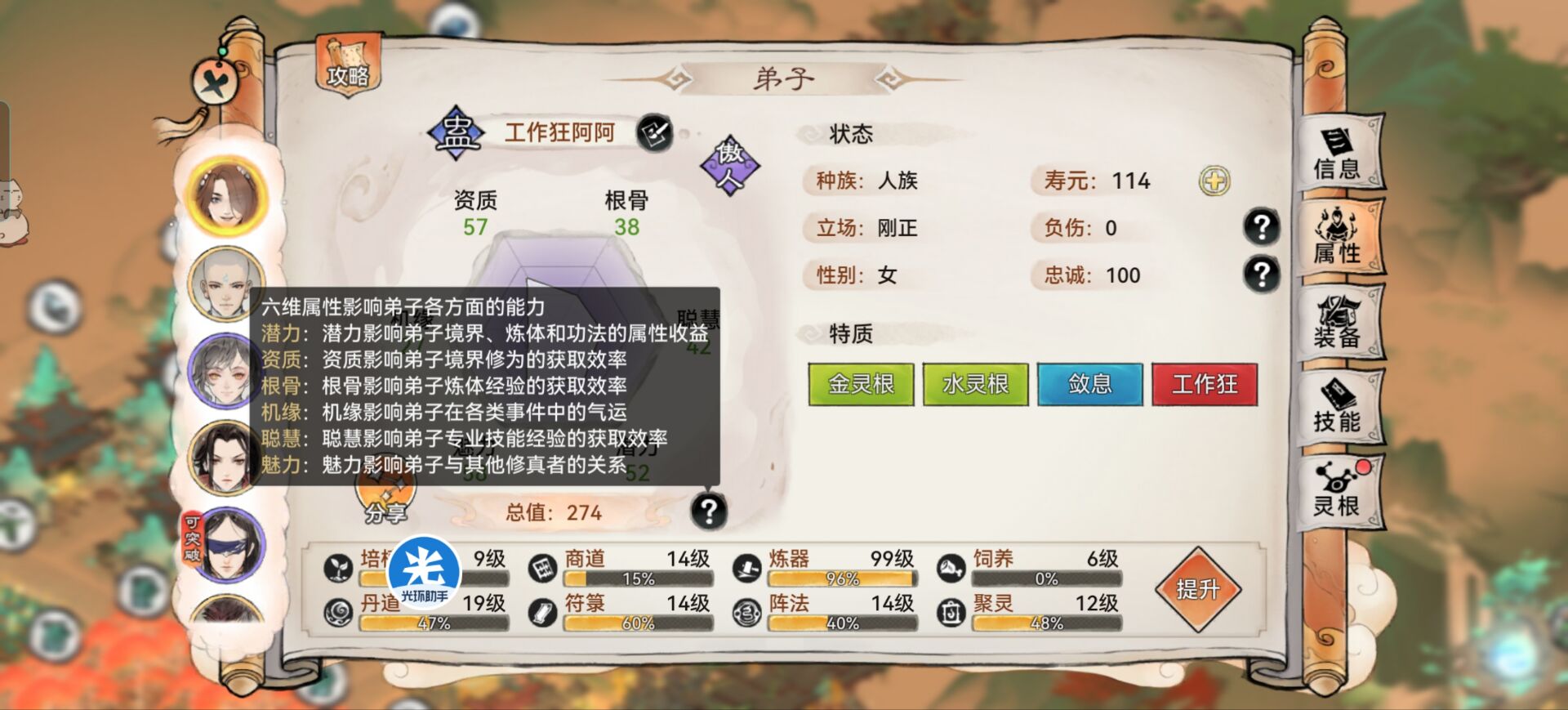 而且这类弟子在吃【书录】的时候还会额外获得15%经验加成,如果在配上高聪慧,可以获得巨大的书录经验加成。