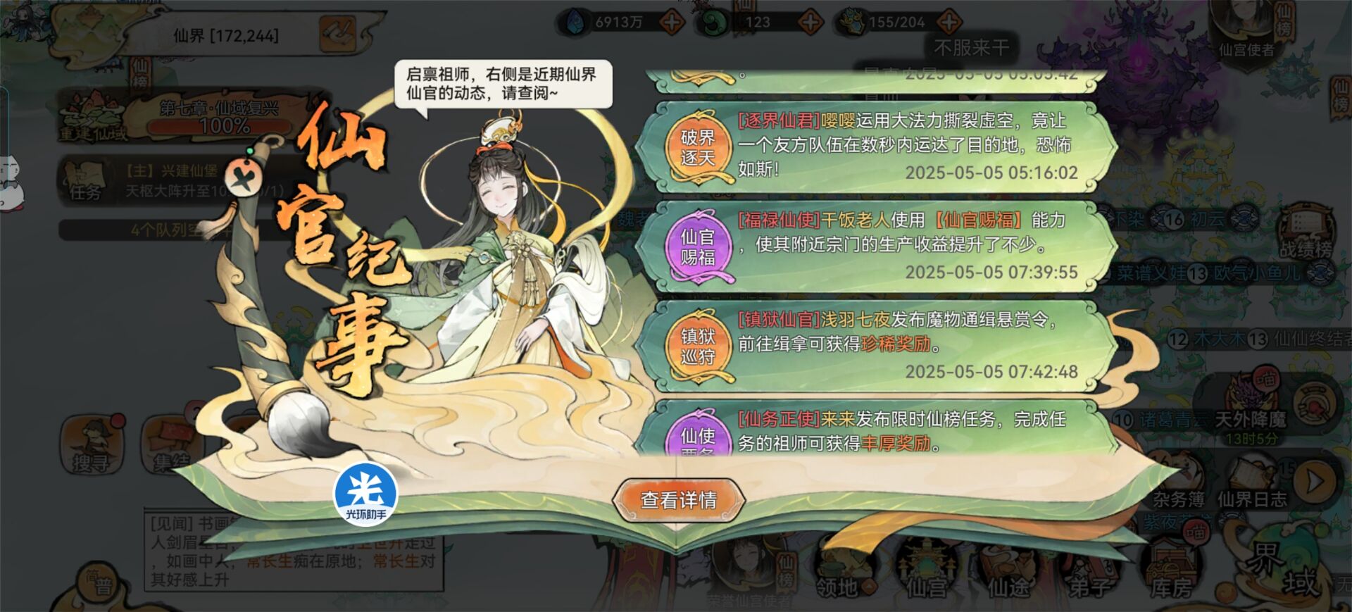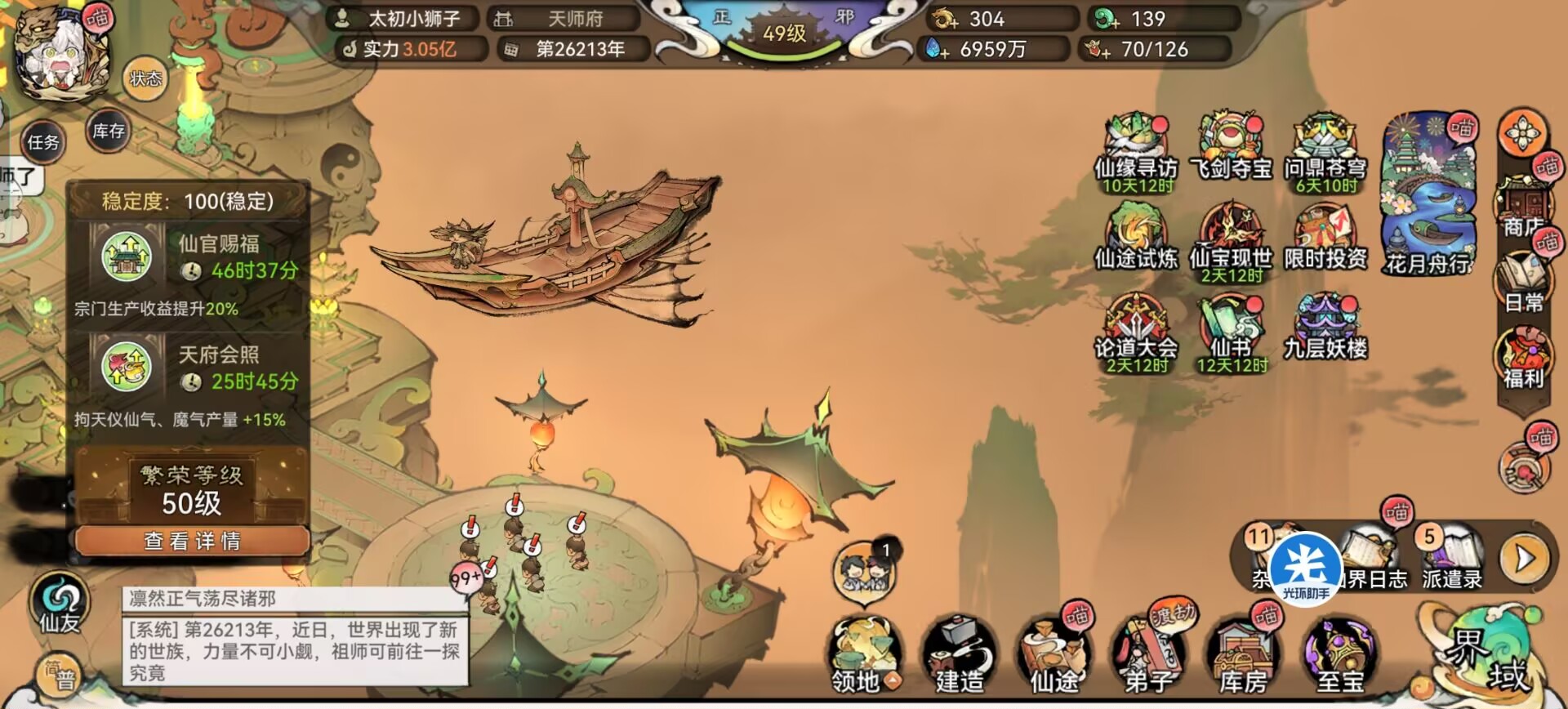 ①【宗门状态】:仙官赐福、开阳会照、玉衡会照、仙域灵光、如日方升。