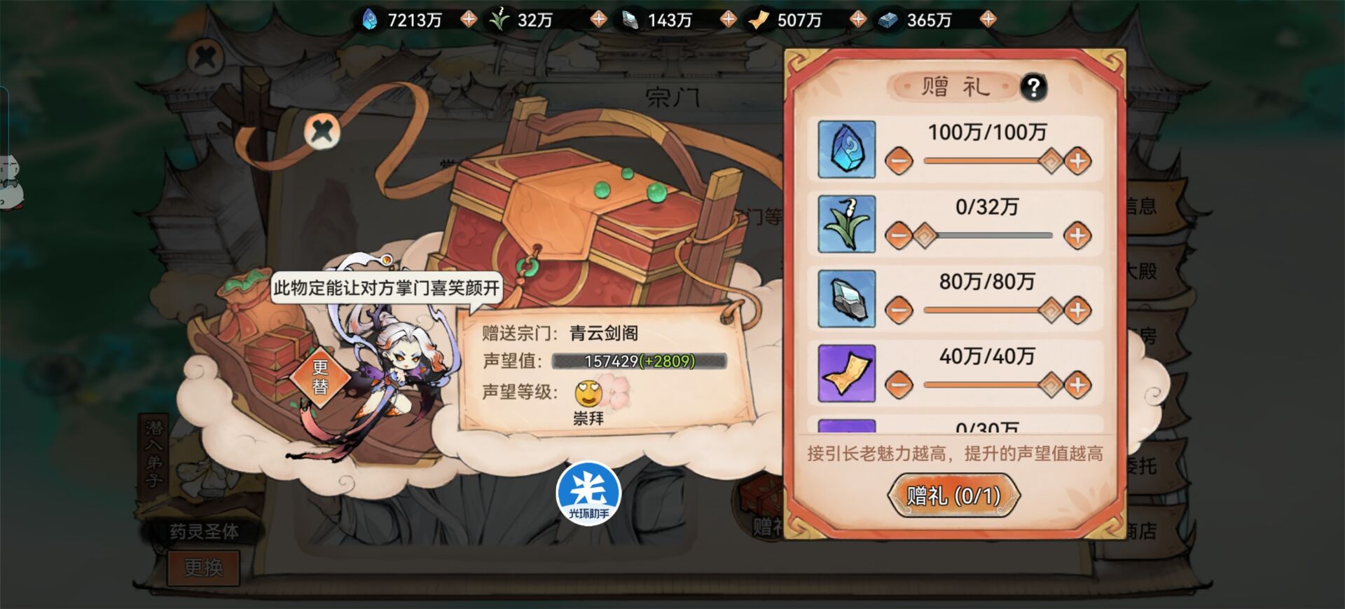 建议送礼优先使用:灵草、灵木、矿石、灵石、这些比较基础的资源。