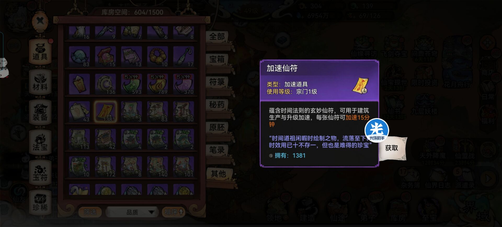 包括【仙缘寻访】抽弟子和商店升级也是可以获得少量的加速符。