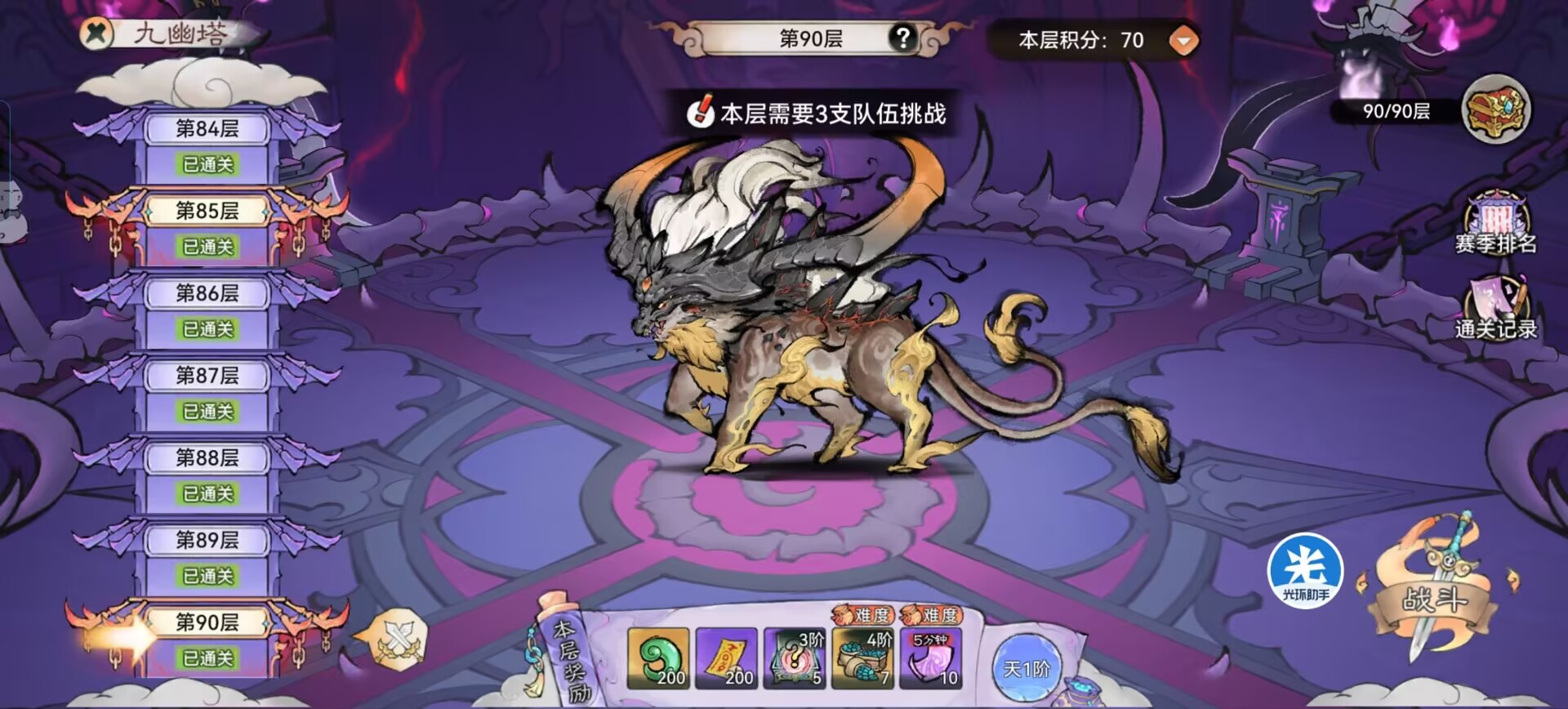 每期的九幽塔,全部通关都可以获得2400张加速符,目前是天阶1的难度,基本上大家都能通关,不知道后续增加难度以后,加速符的获取数量会不会增加,通关难度会不会提升。