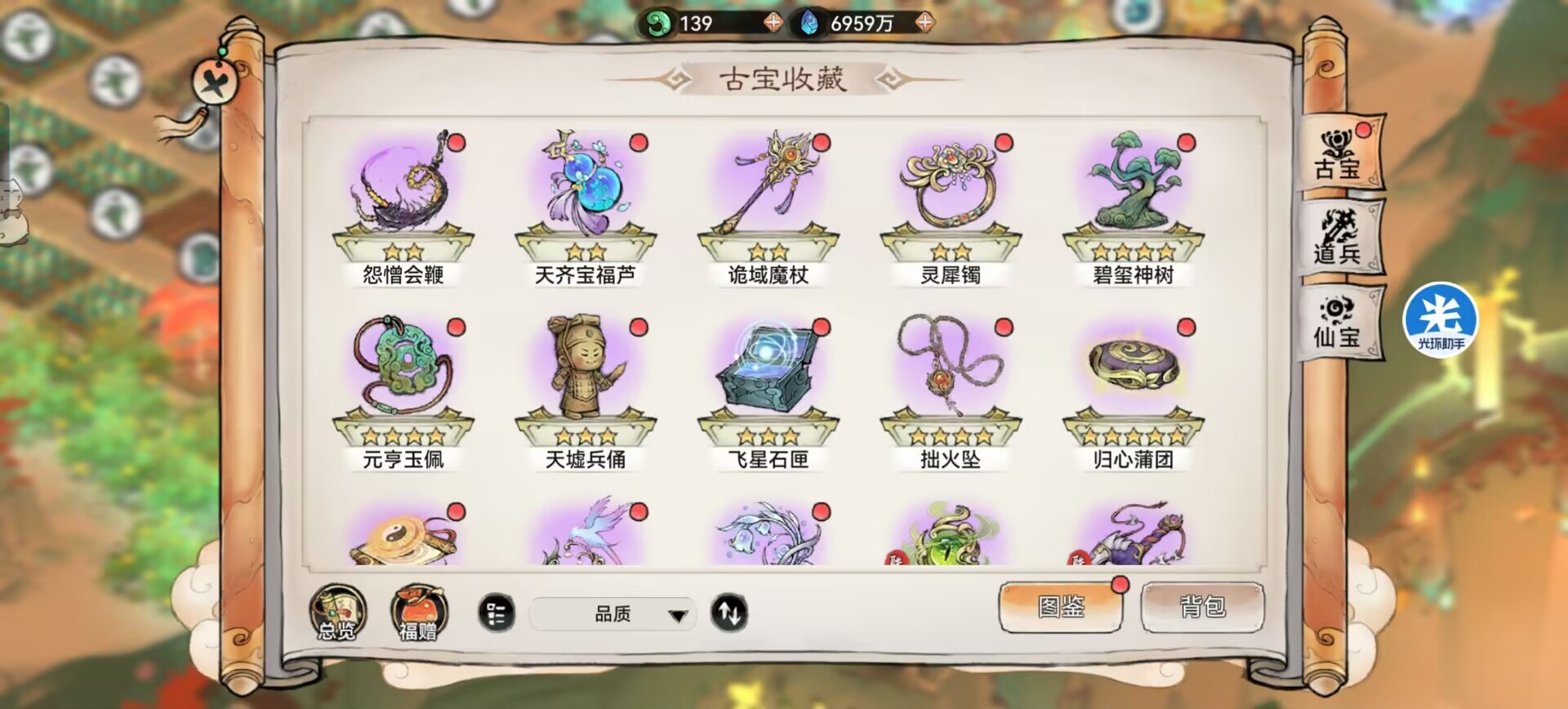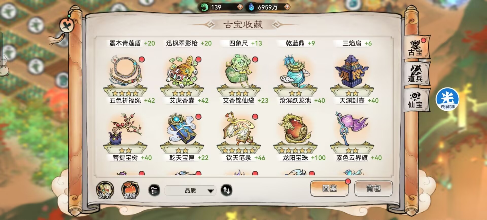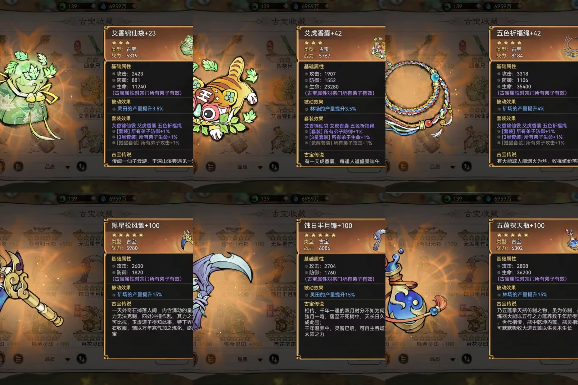 像:五色绳、艾虎香囊、艾香袋。等等这些古宝都是可以提升资源产出的。