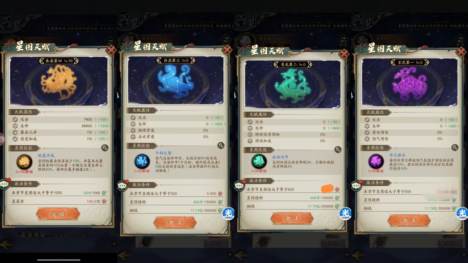 一:【星图】如何点?优先激活哪个?首先星图章节分为:青龙、白虎、玄武、朱雀。
