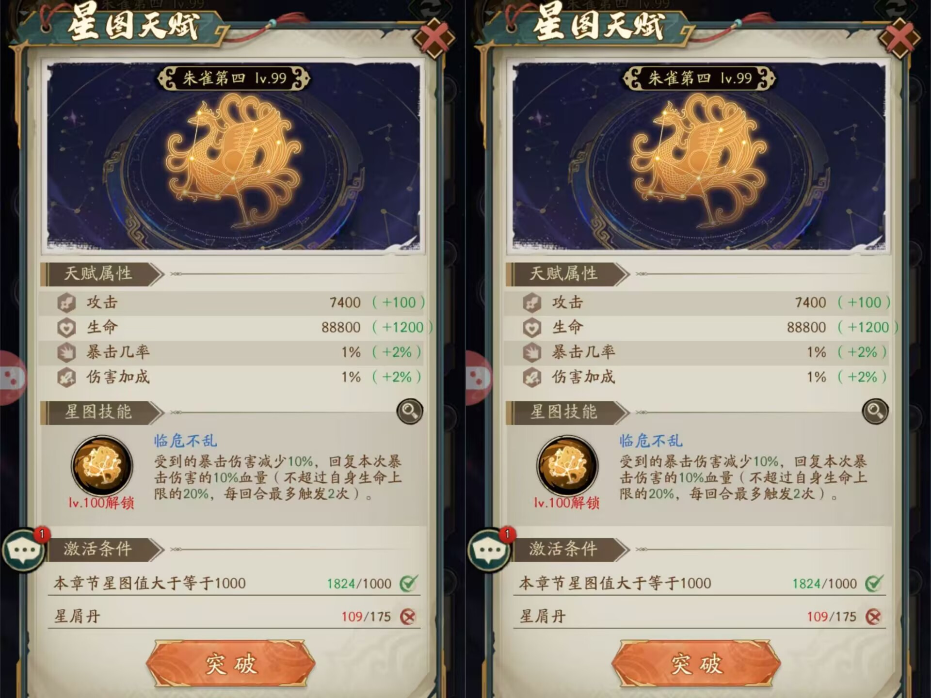 ②朱雀星图属性加成:暴击和伤害加成(适用于所有输出武将)