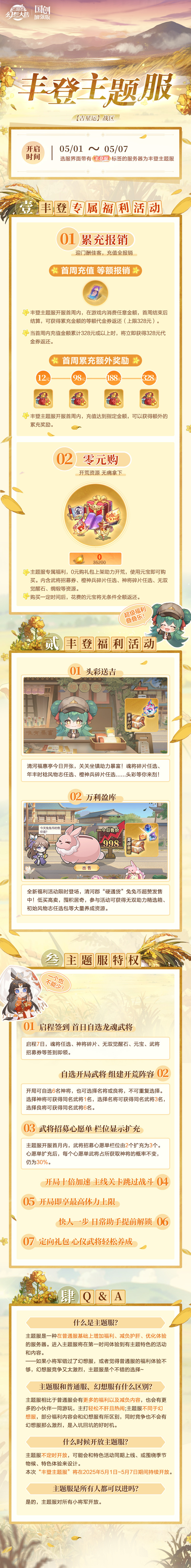 “丰登主题服”现已开启!风禾尽起,丰登福利活动等你参与~光环小G发布于 05-06关注丰登主题服于5月1日-5月7日开放,没错!现在就可以进入主题服进行创角啦!选服界面认准丰登服标签!在丰登主题服中,小将军不仅可以享受开局阵容自选、首日签到自选龙魂武将等福利,充值报销&零元购等福利继续加码!更有趣味丰登福利活动等你体验~这个五月,一起畅玩丰登服吧!这一次不要再错过啦!更多情报可以点击图片查看~