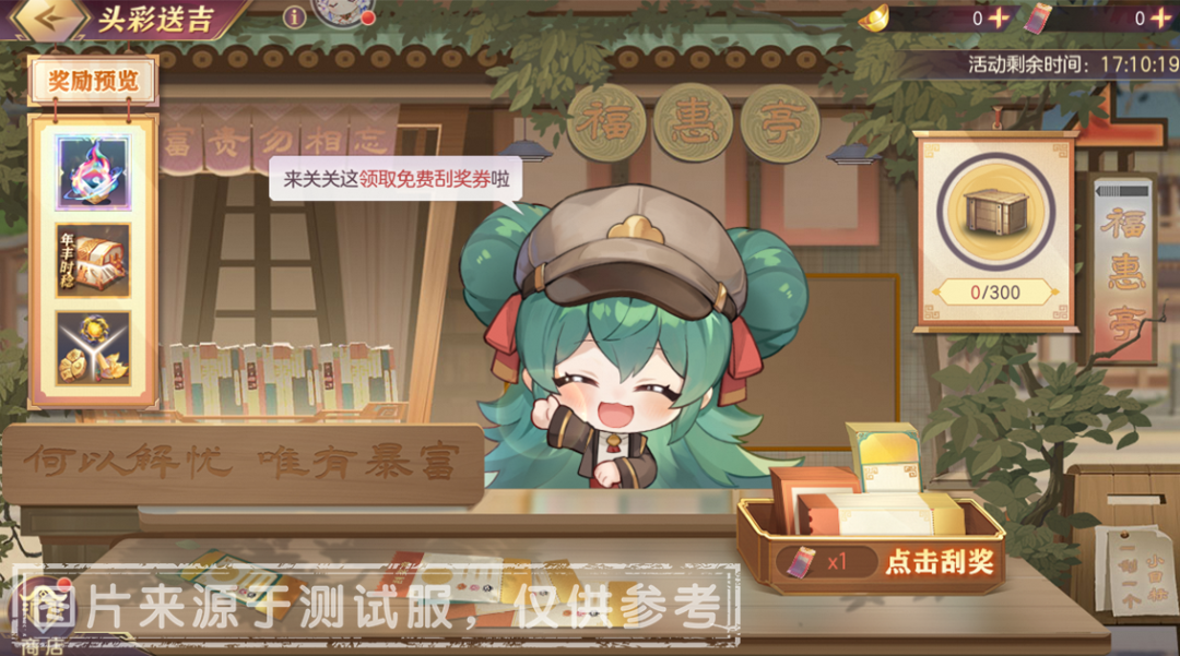 活动期间,小将军们可在活动主页面福惠亭-关关老板处每日免费领取一张「吉彩券」,使用「吉彩券」进行刮奖,每张吉彩券可刮奖5次,并获得吉彩积分和随机道具奖励。