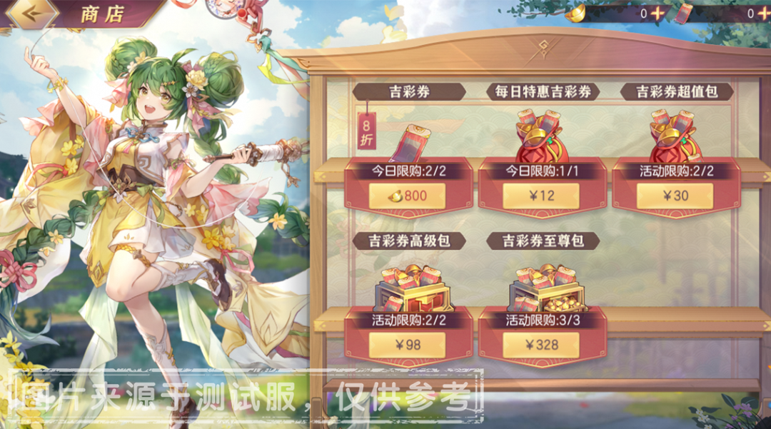 吉彩券:头彩送吉活动专属道具,原价1000元宝,活动期间以8折售卖,单价800元宝,活动期间每日限购2次。
