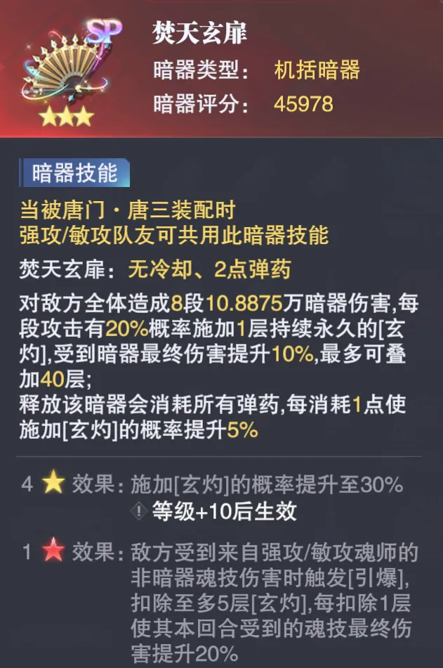 第一个是全新的机扩暗器“焚天玄扉”,这个暗器是为了替代当下的“佛怒唐莲”而设,毕竟暗器唐雅的定位更多是一位增伤辅助,而非暗器队的绝对主C,因此她带“佛怒唐莲”的效果也是远远比不上这个新上线的“焚天玄扉”,接着这个全新SP暗器的效果主要是针对暗器攻击和非暗器攻击的双重增伤,其中: