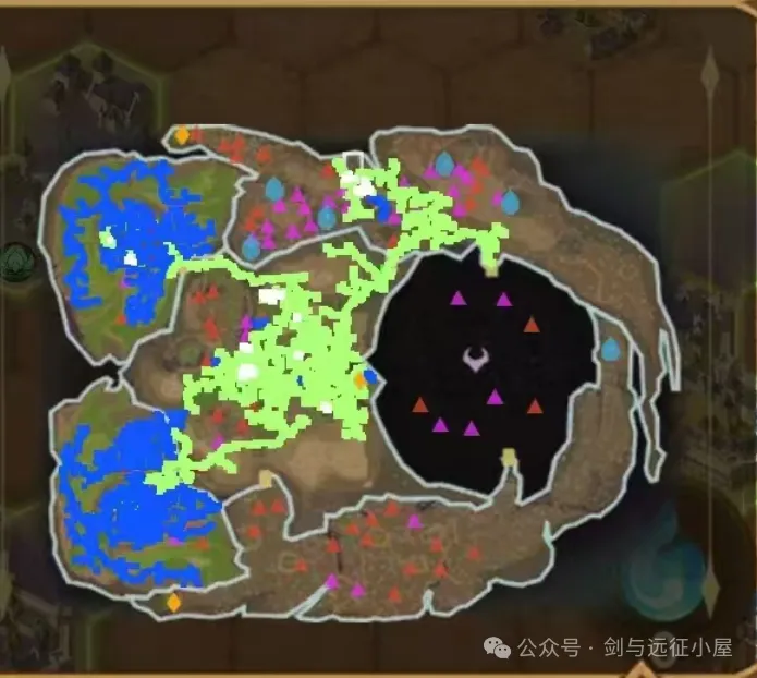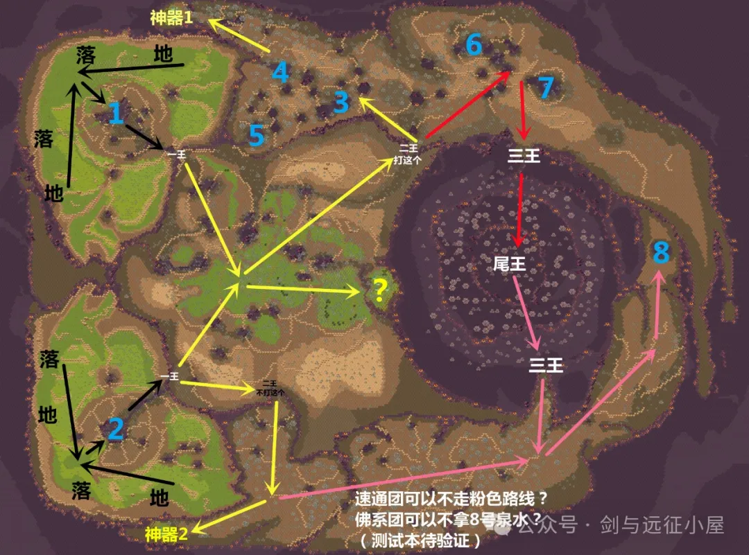 阶段三:上路拿上面的(黄点)神器,下路破二王守卫后拿下面的(黄点)神器,三神器收集完毕