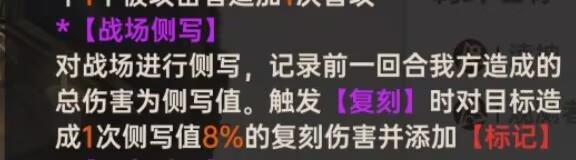 战场侧写:记录前一回的用伤害,然后触发【复刻】时候对目标造成前一个回合8%的伤害+1层标记。