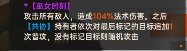 巫女时刻攻击所有人,造成104%倍率的法术伤害,同时共协会用普攻攻击最后被标记的目标直接收割敌人。