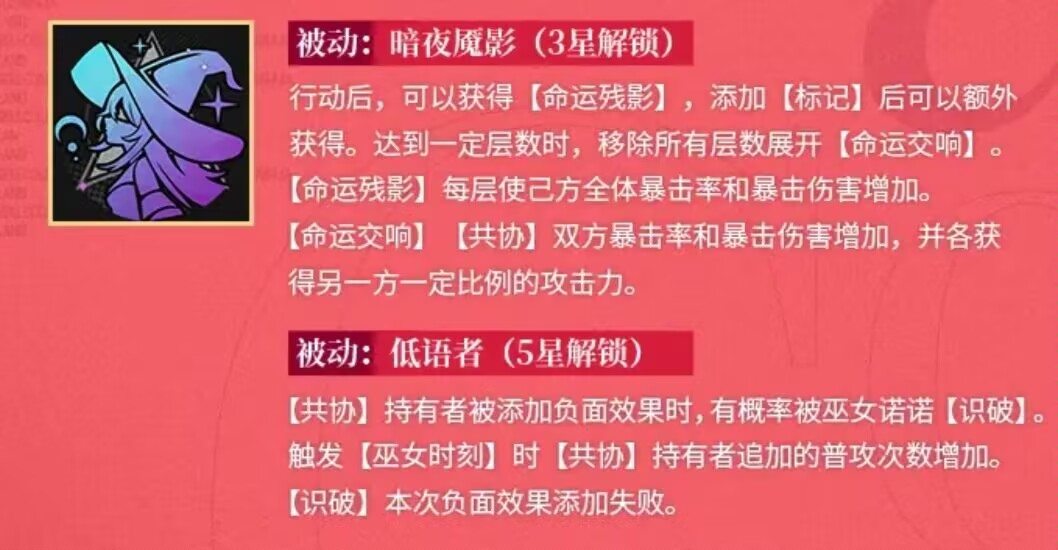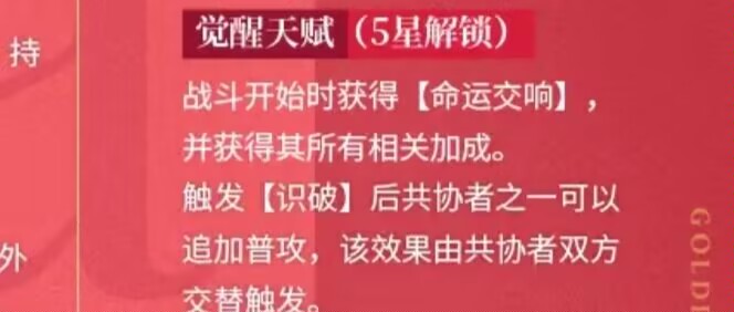 5星就可以发挥出不错的效果,有识破负面和提升共协的追击次数,这点对新区的平民玩家也是比较友好的。