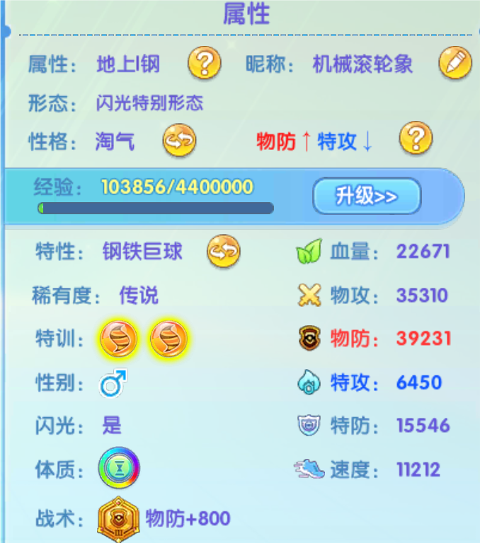 钢铁洪流是增加特防的,剧烈震动的话就是增加物攻,当然了,也可以再使用一个球类或者是弹类招式,但是我查了一下都不是特别好用,除了一个火焰球难搞到手,而且命中率很低以外,其他的都比较一般,那么这次讲一下,如果使用剧烈震动打漂浮或者是飞行属性的宠物,能不能当场给予伤害?这个我是试了一下的是可以的,先开放重力然后造成伤害,那么就保证了自身的两种属性,打击面基本上是没有盲点,如果要说一定的缺点的话,那就是遇到召唤火当场报废,剩下两个技能的话,就是一个替身,同时可以给对方带来混乱状态,还有一个技能是回血的,这个机动盾牌技能拥有增加自身能力的效果,不过是在下回合发动,如果这个时候切换队友,那么就可以给队友提供能力了,如果不切换的话,那么能力将会给自身增加这个能力,就是双攻和速度,关于这个惊人的具体玩法的话,就是很恶心,首先就是来一个替身,然后由于不怕被对方甩走,所以可以使用技能疯狂的甩来甩去,让对面恶心到爆炸,由于自身的物防就算不是在极限满配状态下,也可以获得3万5的面板,这个数值面板不是一般的物防宠物,能够超过的就更不用说大多数的输出宠物撑死也就1万6左右的物防,所以保证了自身的甩人效果是100%的,那么更恶心的点就是如果自身是一个钉子队伍,那就可以将这只大象的机制发挥到极佳状态,甩来甩去,还可以给对方,增加间接伤害缺点就是自身防止不了对方解除钉子。