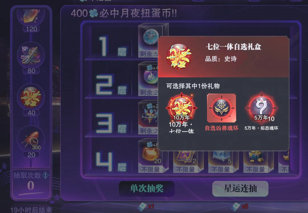 - 左侧160抽累抽赠送的3个七位一体魂环自选获取成本为:9600钻+110元