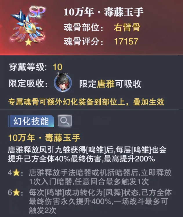 - 左侧200抽累抽赠送的SP唐舞桐右腿专属魂骨获取成本为:9600钻石+300元