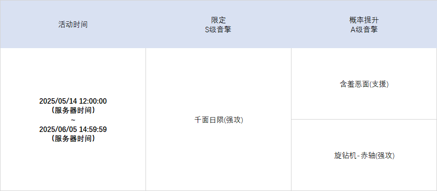 • 活动时间:2025/05/14 12:00:00(服务器时间)~2025/06/05 14:59:59(服务器时间)