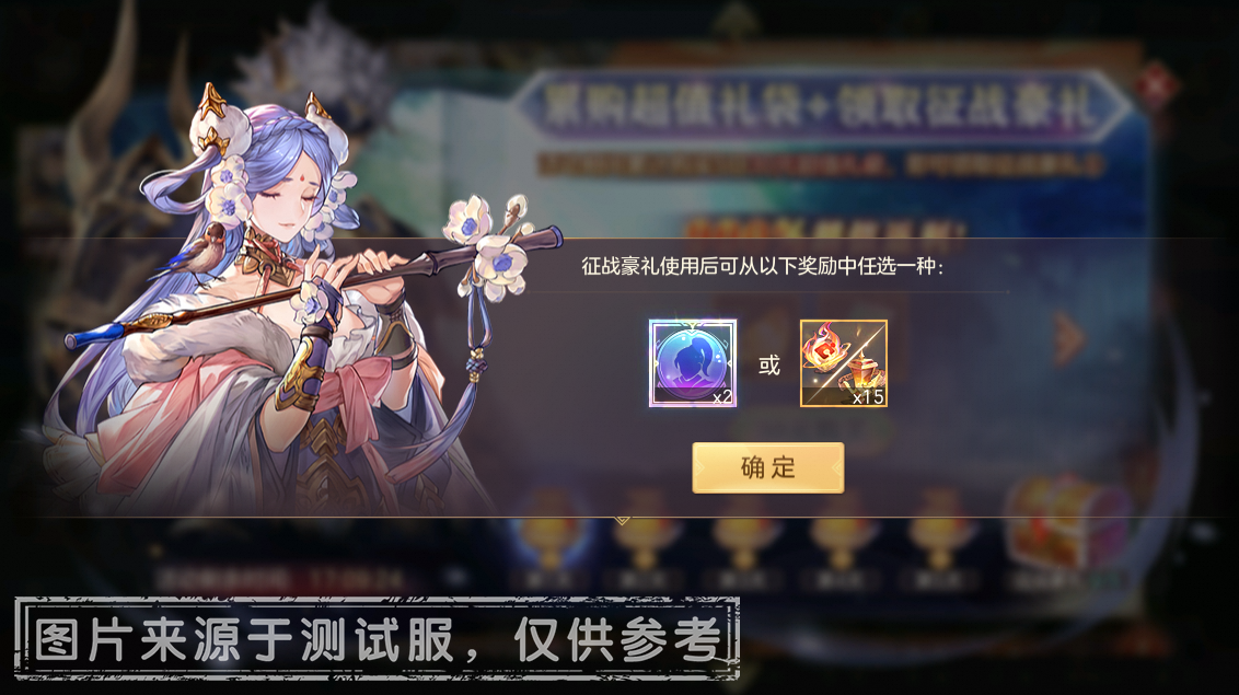 征战豪礼: 「武将命魂信物二十选一」*2,「神兵或神将碎片任选」*15