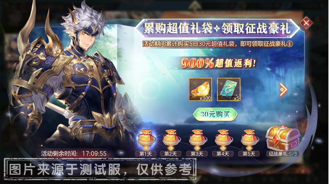 活动期间内,小将军可在活动界面花费30元购买特惠商品【超值礼袋】。每日05:00将解锁一个【超值礼袋】的购买限制,小将军可以在同一日购买多款已解锁礼包,不限制购买次序。累计完成5个【超值礼袋】的购买,即可开启额外奖励【征战豪礼】。